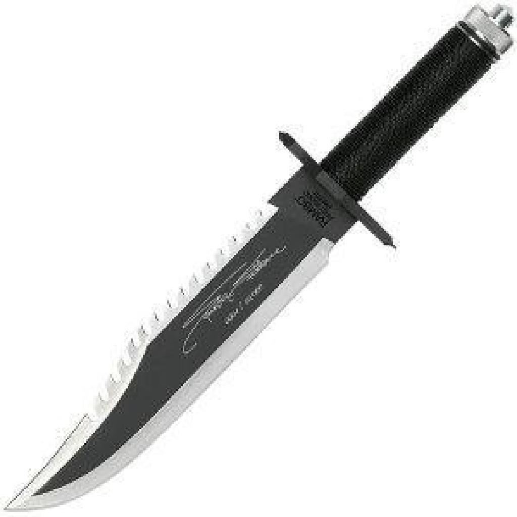 Long Description Sylvester Stallone is Rambo, and has made this character not only an Icon of American culture, but also a symbol of American Freedom & Patriotism. Officially authorized by Sylvester Stallone, this knife features an authentic reproduction of his signature, and is a strictly Limited Edition of just 10,000 individually serial numbered pieces worldwide. We are proud to present our Rambo knives Masterpiece Collection, the finest Officially Licensed Rambo knives ever produced. No detail has been spared to make these knives the most accurate and highest quality licensed Rambo knives ever made. Each Sylvester Stallone Signature edition knife measures 15 inch overall length and comes with an individually serial numbered blade. Features a top quality 420 stainless steel blade with slotted saw teeth, a hollow handle with survival kit, aluminum butt cap with precision compass and a double screwdriver guard. Features Each knife individually serial numbered 15" overall length. Top quality 420 stainless steel " thick blade with center slotted saw teeth and matte black finish. Hollow handle wrapped in heavy O.D. black nylon cord with waterproof O ring and survival kit with Survival Kit Silencer. Stainless steel guard with lashing holes. Non-magnetic aluminum butt-cap with precision compass and lanyard hole. Phillips and standard screwdriver points. High quality top grain genuine Buffalo hide leather sheath with leg tie. Two-piece Diamond Sharpening Rod in leather pouch Officially Licensed reproduction.