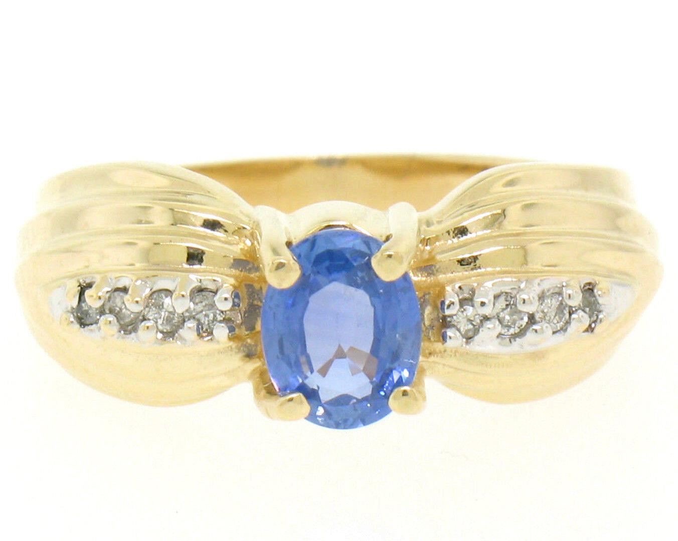 NEW Ribbed 14k Yellow Gold 1.10ctw Oval Tanzanite Solitaire & Round Diamond Ring. Please see photos and description for all available information. A new solid 14k yellow gold ribbed solitaire ring, featuring 1 oval cut natural Tanzanite (5.34x6.85mm - 1.02ct), and 8 round brilliant cut natural diamonds (H- SI1; 0.08ctw). The ring is size 7.5, weighs a total of 6.3 grams, and measures 13.36mm wide.