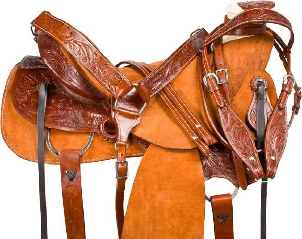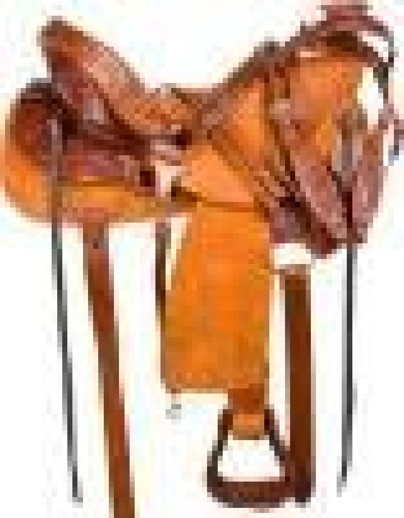 Saddle Specifications: Color: Natural & Dark Oil 100% Premium Leather Rough Out Leather Hand Carved Floral Tooling Wade Tree Design Numerous Ties Dropped D Rigging Well-Padded Fleece Underside Wood Base Tree With Fiberglass Reinforcements Saddle Measurements: Seat: 16 Gullet: 7 FQHB Skirt: 27.5 Horn: 3 x 5 Top Swell: 8 Cantle: 4.5 Stirrups: 32-39 with room for adjustments Weight: Approx. 35 lbs.