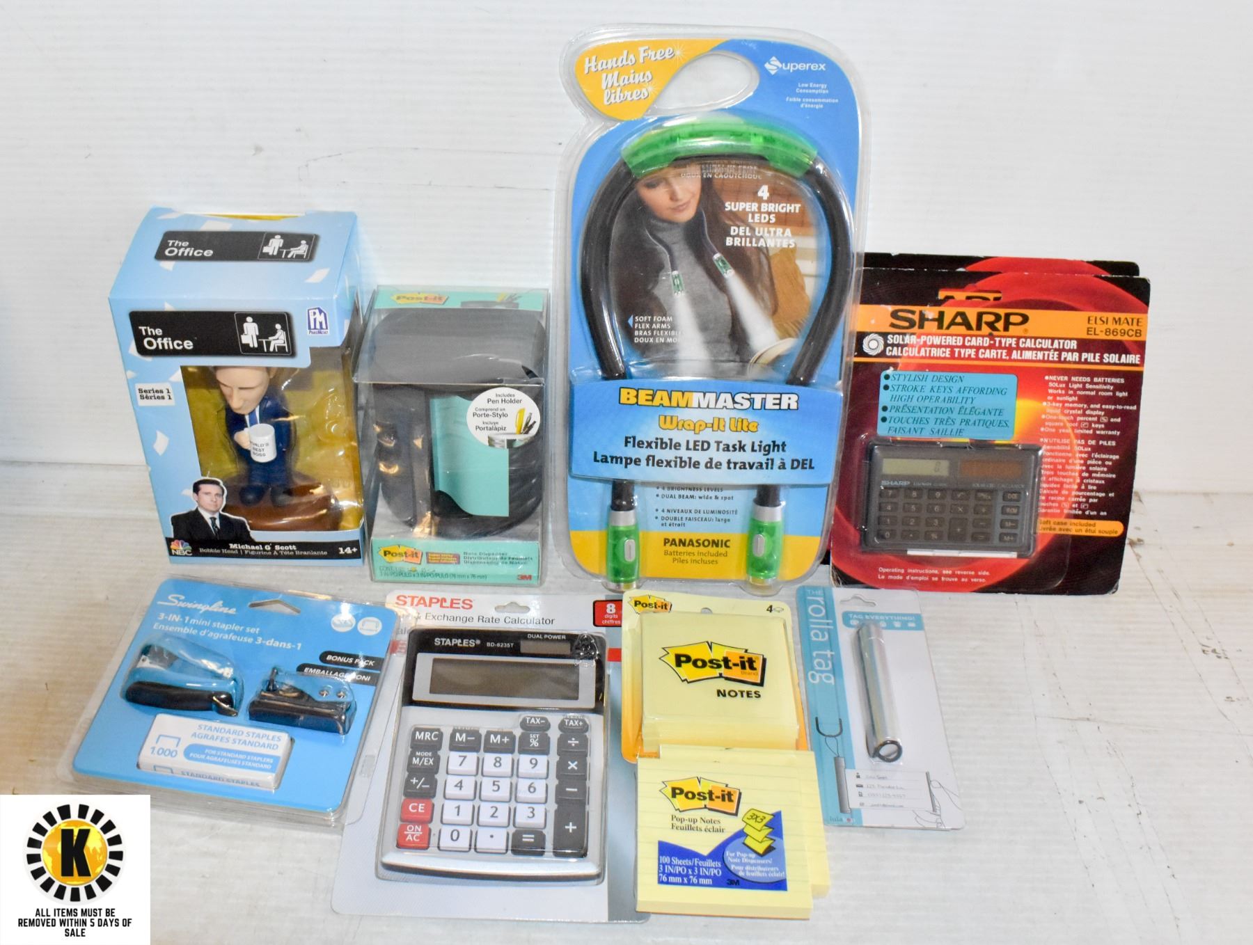 POST IT NOTE DISPENSER & PEN HOLDER, STAPLES CALCULATOR, SWING LINE 3 IN 1 STAPLER SET, ROLLA TAG, PANASONIC BEAN MASTER WRAP LED FLEXIBLE TASK LIGHT, & MORE