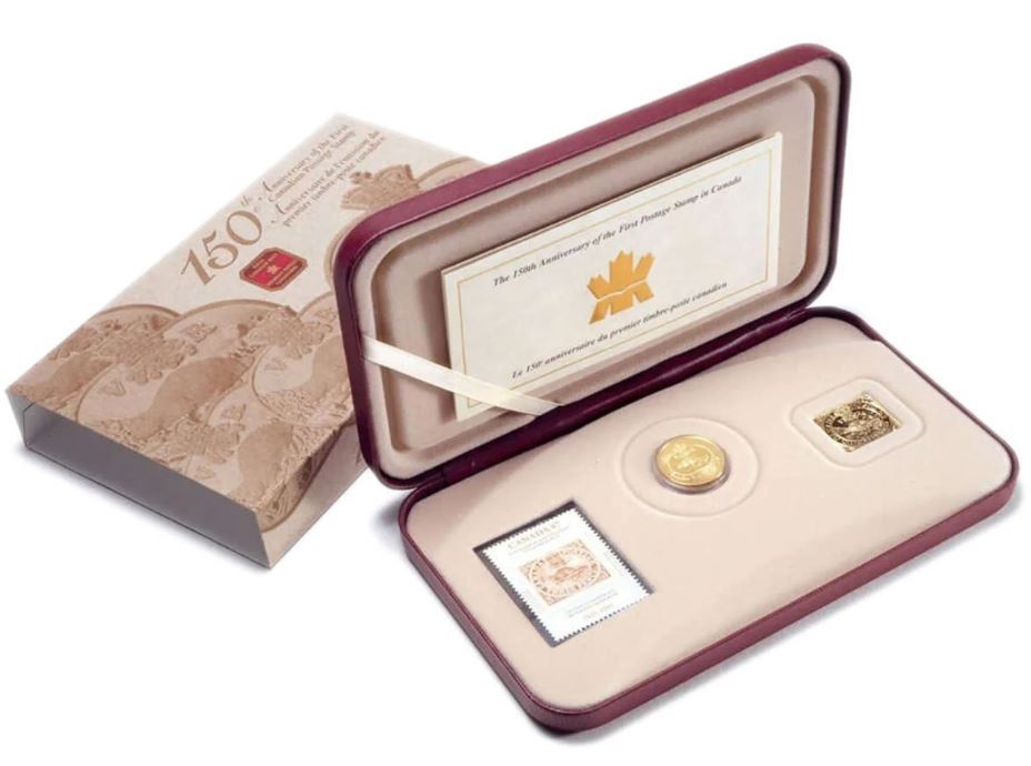 OF THE FIRST CANADIAN POSTAGE STAMP SET. COIN AND STAMP. COIN IS .925 SILVER. PICTURE OF OPEN SET BORROWED FROM ONLINE, YOURS IS NEW SEALED