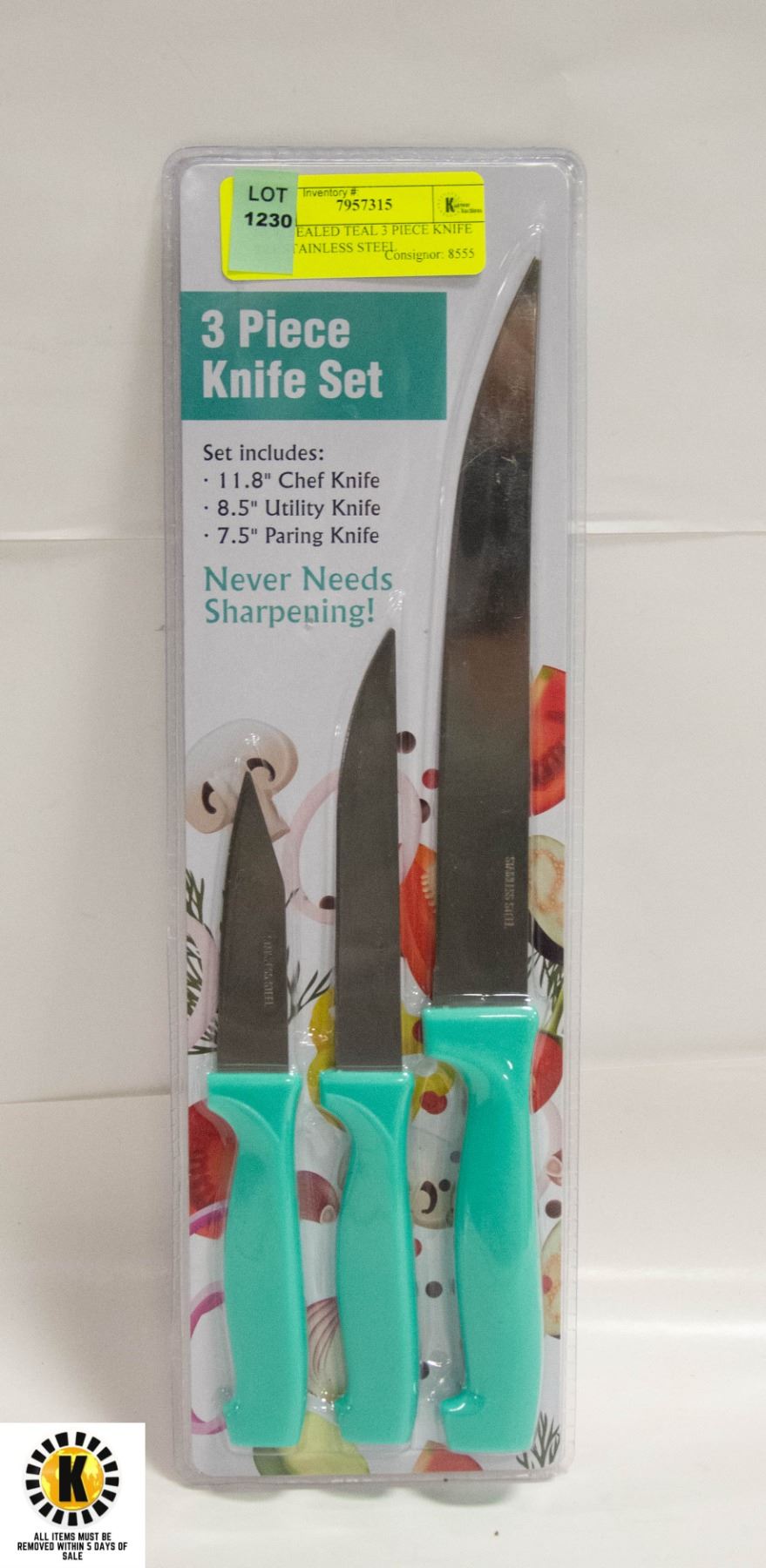 11.8" CHEFS KNIFE, 8.5" UTILITY KNIFE, 7.5" PARING KNIFE **ALL ITEMS MUST BE REMOVED BY 5PM SATURDAY, APRIL 22ND, 2023. ALL REMAINING ITEMS WILL BE SUBJECT TO A $6.00 PER DAY STORAGE CHARGE. ANY ITEMS REMAINING AFTER MONDAY, MAY 8TH, 2023 WILL BE CONSIDERED FORFEITED. NO REFUNDS WILL BE ISSUED FOR FORFEITED ITEMS.** TO SCHEDULE A PICK UP APPOINTMENT CLICK HERE