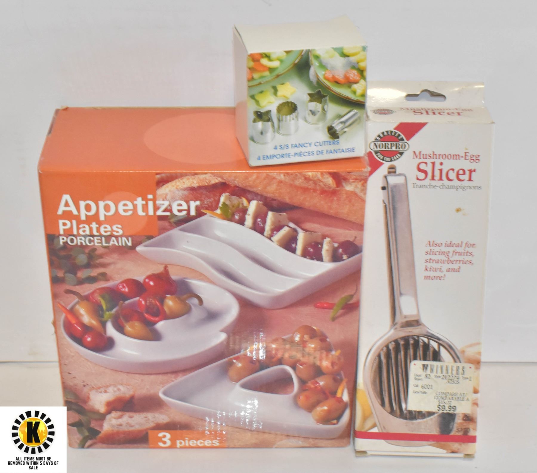 TUBE SHAPER NORPRO MUSHROOM, EGG, FRUIT SLICER, REGAL FANCY CUTTERS, WHITE PORCELAIN APPETIZER PLATE SET. ALL NEW IN BOX KITCHEN PRODUCTS
