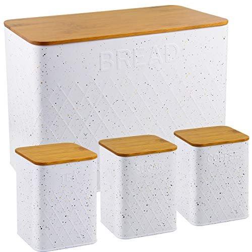 BREAD, SUGAR, COFFEE, TEA BINS, STAINLESS STEEL BODY WITH WOOD LIDS AND RUBBER SEALS