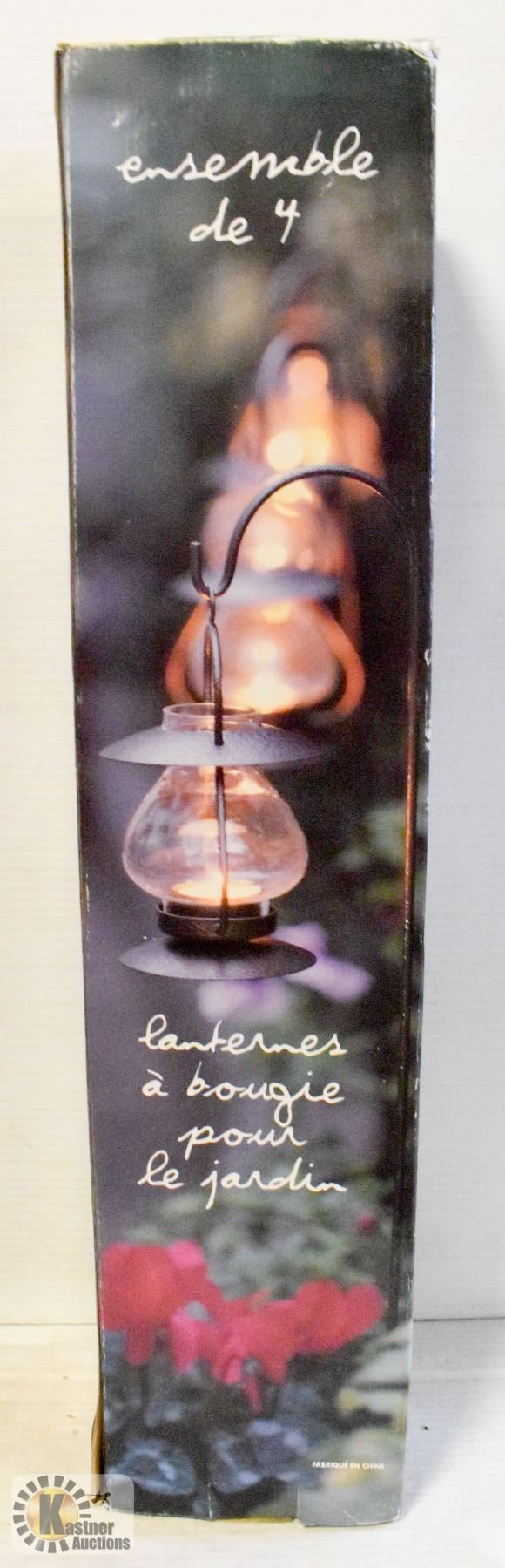 NEW SET OF 4 LANTERNS, HANGER RODS + TEA CANDLES