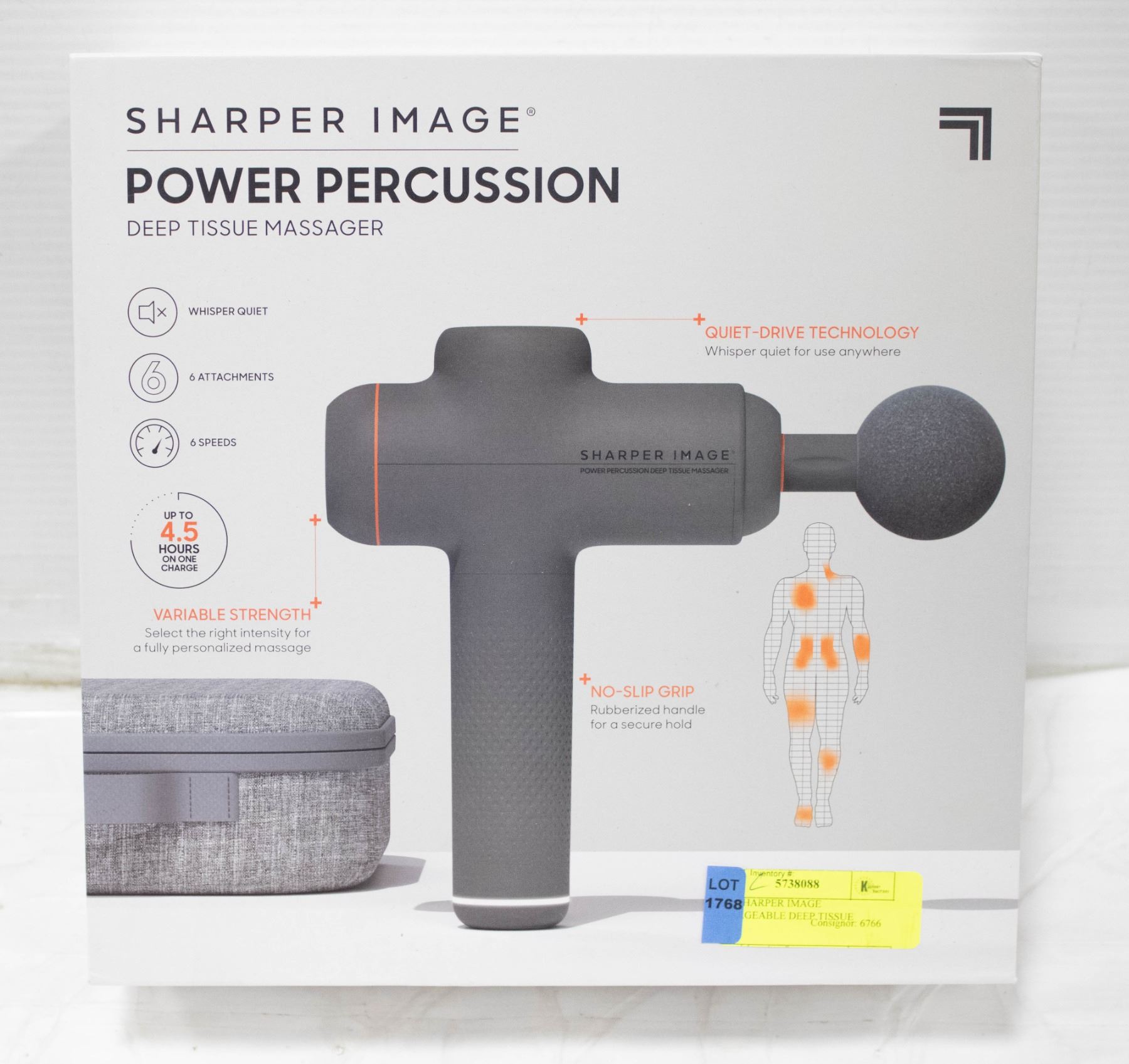MASSAGER. POWER PERCUSSION. WITH 6 ATTACHMENTS. 4.5 HOURS ON ONE CHARGE **ALL ITEMS MUST BE REMOVED BY 5PM SATURDAY, DECEMBER 16TH 2023. ALL REMAINING ITEMS WILL BE SUBJECT TO A $6.00 PER DAY STORAGE CHARGE. ANY ITEMS REMAINING AFTER TUESDAY, JANUARY 2ND 2023 WILL BE CONSIDERED FORFEITED. NO REFUNDS WILL BE ISSUED FOR FORFEITED ITEMS. TO SCHEDULE A PICK UP APPOINTMENT CLICK HERE
