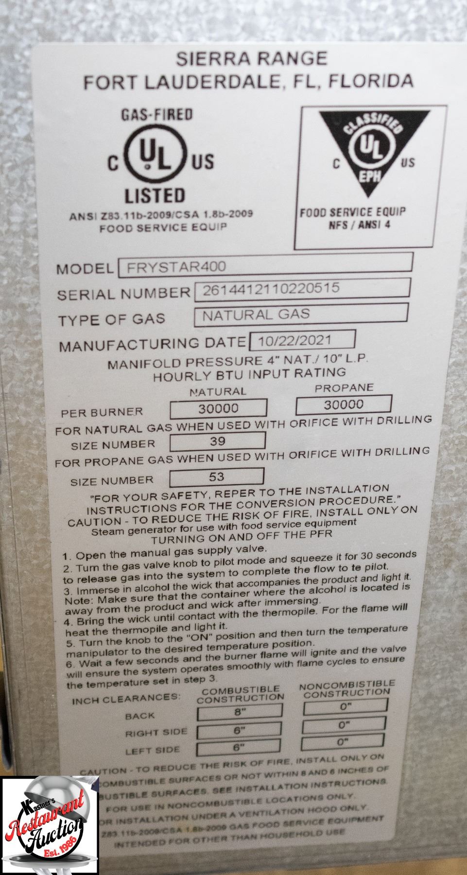 MODEL # FRYSTAR400, NATURAL GAS, D.O.M. 11 / 24/ 2021, 30,000 BTU PER BURNER, 16" X 31" X 51"