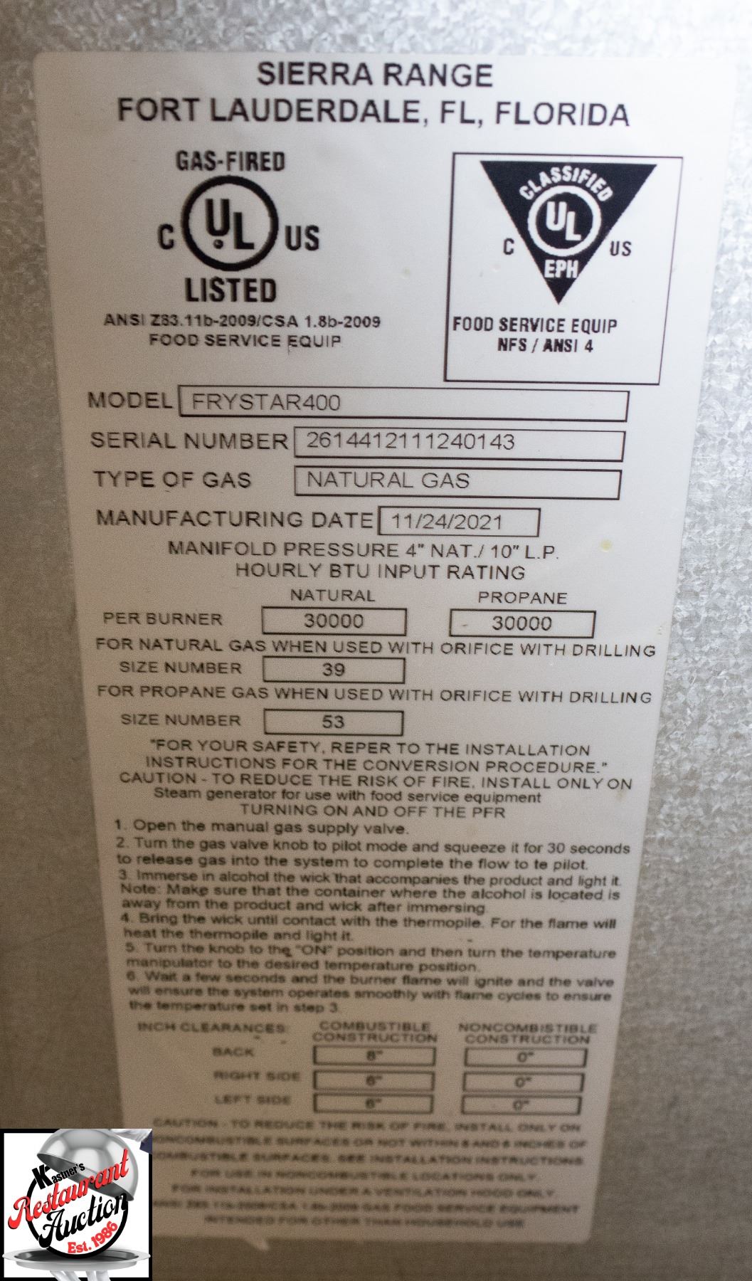 MODEL # FRYSTAR400, NATURAL GAS, D.O.M. 11 / 24/ 2021, 30,000 BTU PER BURNER, 16" X 31" X 51"