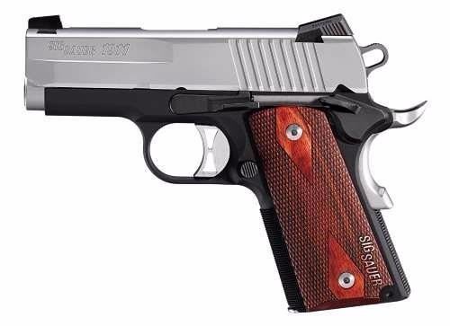 FAMILY:1911 Style Pistol Series MODEL:1911 Ultracompact TYPE:Semi-Auto Pistol ACTION:Single Action FINISH:Stainless/Black Two Tone STOCK/FRAME:Steel Frame STOCK/GRIPS:Blackwood CALIBER/GAUGE:9mm CAPACITY:8+1 # OF MAGS:2 MAGAZINE DESC:8 rd. BARREL:3.3" OVERALL LENGTH:6.8" SIGHTS:Low-profile SIGLITE Night Sig SAFETY:Grip Safety ADDL INFO:Two-Tone ADDL INFO:checkered front strap ADDL INFO:Beavertail frame