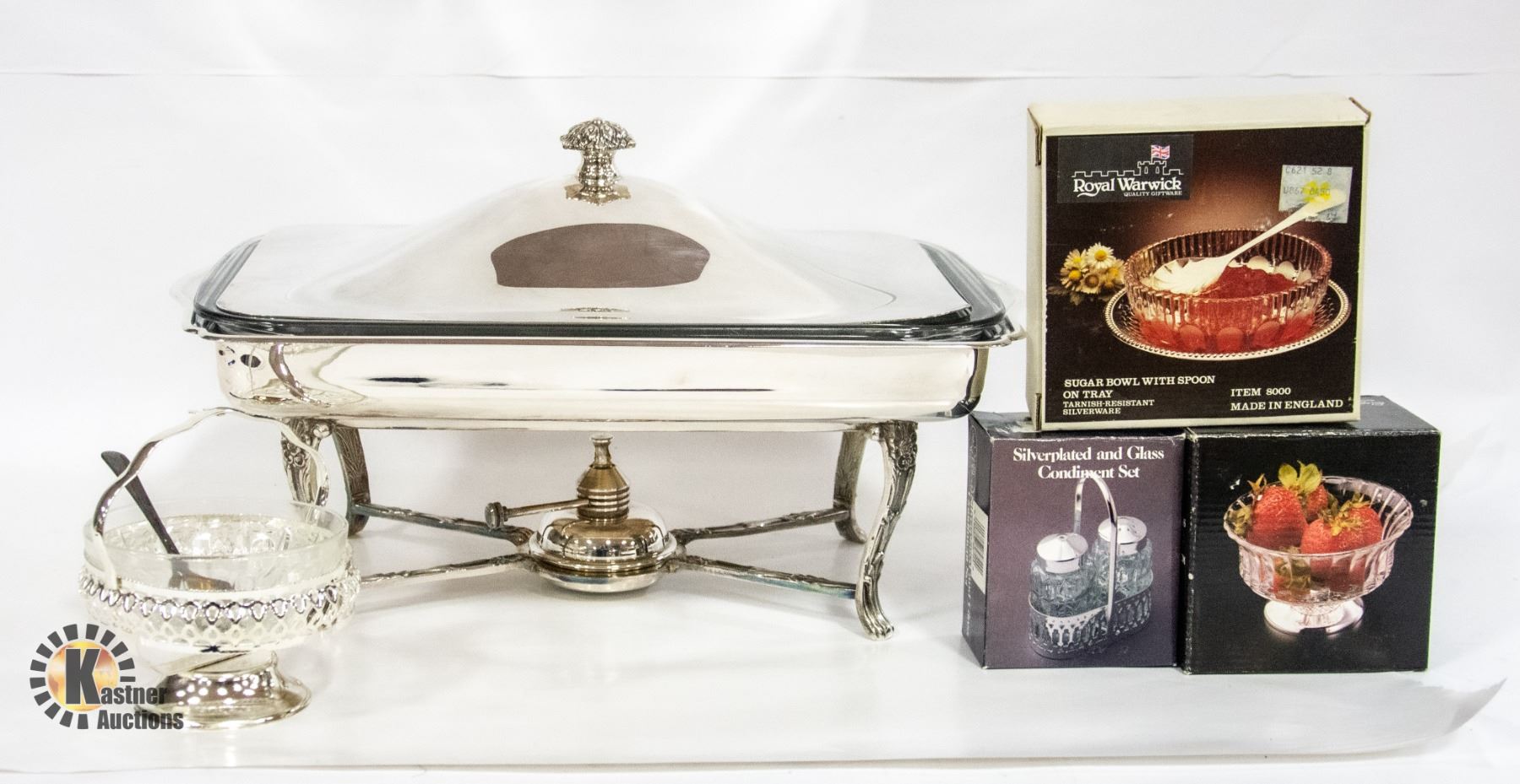 VARIOUS NEW IN BOX VINTAGE SILVER PLATED TABLEWARE ACCESSORIES AND CHAFING DISH. **ALL ITEMS MUST BE REMOVED BY 5PM SATURDAY, APRIL 15TH 2023. ALL REMAINING ITEMS WILL BE SUBJECT TO A $6.00 PER DAY STORAGE CHARGE. ANY ITEMS REMAINING AFTER MONDAY, APRIL 30TH, 2023 WILL BE CONSIDERED FORFEITED. NO REFUNDS WILL BE ISSUED FOR FORFEITED ITEMS. TO SCHEDULE A PICK UP APPOINTMENT CLICK HERE