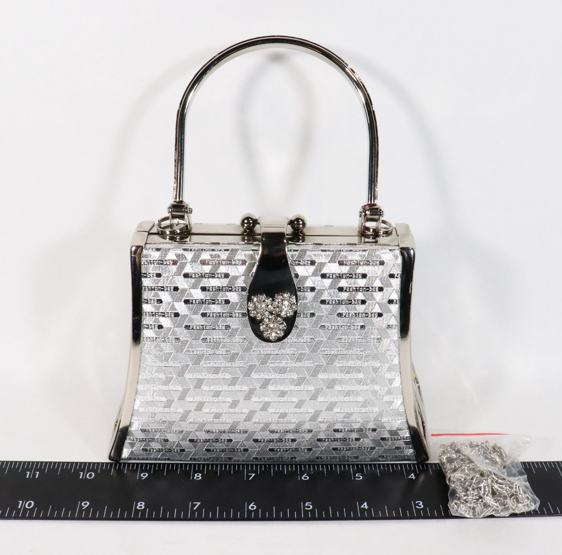 HAS DETACHABLE METAL SHOULDER CHAIN STRAP. HAVE RHINESTONE FLOWER ACCENTS ON CLASP.
