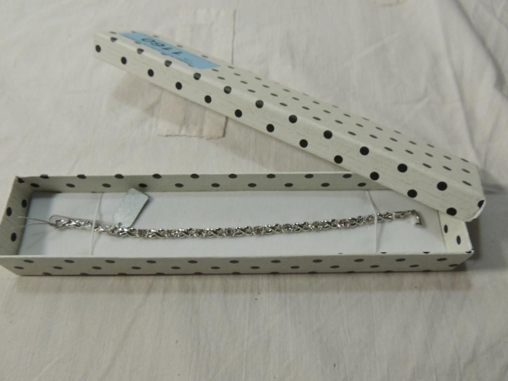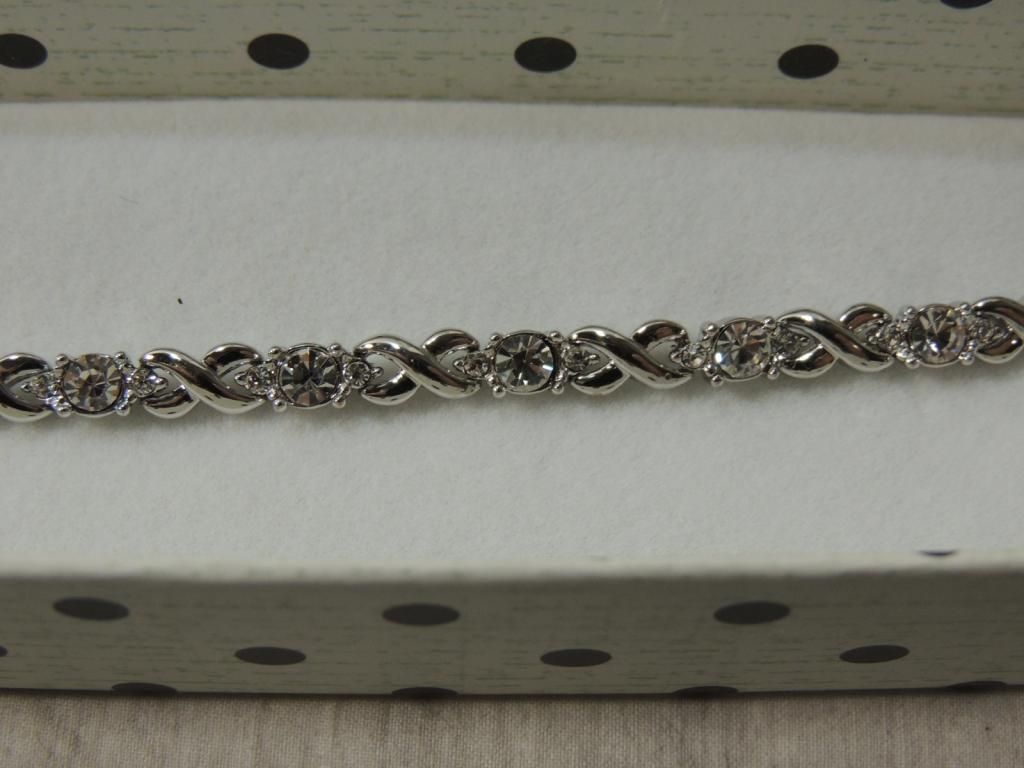 7 1/2" SILVERTONE CZ STONE TENNIS BRACELET. LARGER CZ STONE AND TWO SMALLER ONES ON SIDES. FASHION JEWELRY. NEW COSTUME JEWELRY. AS SHOWN. SEE PHOTO FOR MORE DETAILS