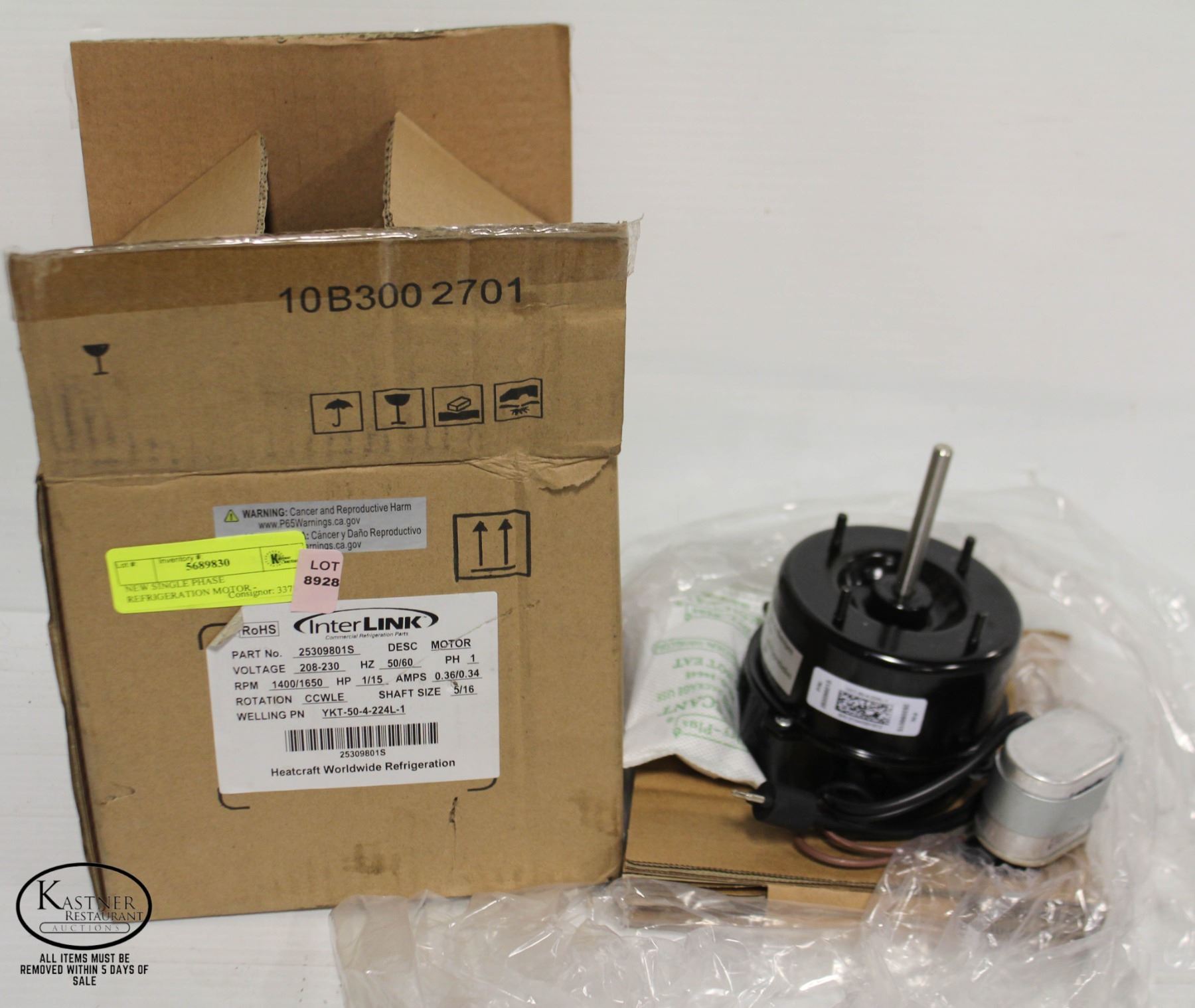 HEATCRAFT WORLDWIDE REFRIGERATION, PARTS. M# 25309801S. 208/220V, 03.6/0.34A, 1/15 HP, 1400/1650 RPM. 5/16" DRIVE **ALL ITEMS MUST BE REMOVED BY 5PM MONDAY, JULY 3RD, 2023. ALL REMAINING ITEMS WILL BE SUBJECT TO A $6.00 PER DAY STORAGE CHARGE. ANY ITEMS REMAINING AFTER MONDAY, JULY 17TH, 2023 WILL BE CONSIDERED FORFEITED. NO REFUNDS WILL BE ISSUED FOR FORFEITED ITEMS.** TO SCHEDULE A PICK UP APPOINTMENT CLICK HERE