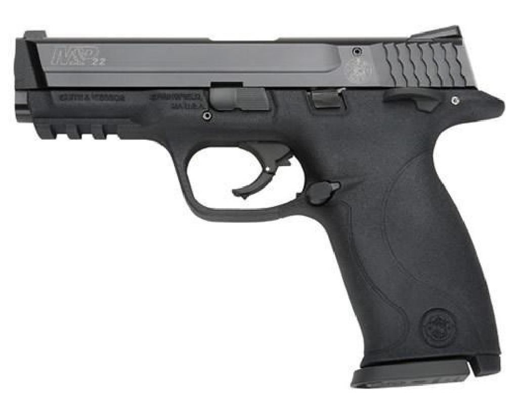 FAMILY:M&P Series MODEL:M&P22 TYPE:Semi-Auto Pistol ACTION:Single Action FINISH:Black STOCK/FRAME:Polymer Frame STOCK/GRIPS:Black Polymer CALIBER/GAUGE:22 LR CAPACITY:10+1 BARREL:4.1" OVERALL LENGTH:7.6" SIGHTS:Adjustable SAFETY:Ambidextrous Manual Safety ADDL INFO:Picatinny-Style Accessory Rail ADDL INFO:Ambidextrous Slide Stop ADDL INFO:Reversible Magazine Release