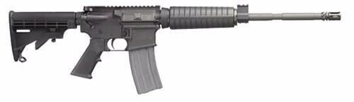 Mfr Items:Smith & Wesson Category:TACTICAL RIFLES Metal Finish:Black Action:Semi-Automatic Caliber:223 Remington/5.56 NATO Barrel Length:16.0" Capacity:30+1 Trigger:Standard Safety:Lever OAL:32"-35" Weight:6.5 lbs Stock Description:6-Position Black Muzzle:A2 Flash Hider Receiver Material:Aluminum Sights:None (Optic Ready) Barrel Description:4140 Steel Twist:1:9" Hand:Right Stock Finish Group:Synthetic Metal Finish Group:Blued/Black