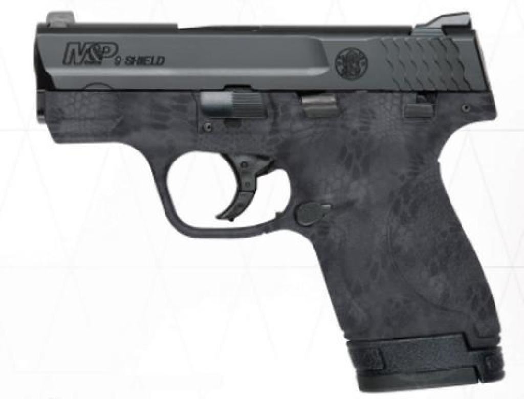 FAMILY:M&P Series MODEL:M&P9 Shield TYPE:Semi-Auto Pistol ACTION:Double Action Only FINISH:Kryptek Typhon STOCK/FRAME:Polymer Frame STOCK/GRIPS:Kryptek Camo CALIBER/GAUGE:9mm CAPACITY:8+1 # OF MAGS:2 MAGAZINE DESC:One 8 rd. & One 7 rd. BARREL:3.1" OVERALL LENGTH:6.1" SIGHTS:FS:White Dot/RS:Low Pro Carry SAFETY:Manual Thumb Safety ADDL INFO:Striker Fire EXCLUSIVE:TALO EXCLUSIVE