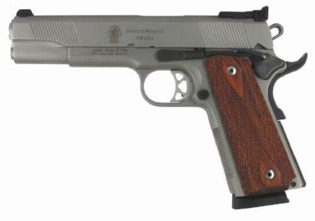 FAMILY:1911 Style Pistol Series MODEL:SW1911 TYPE:Semi-Auto Pistol ACTION:Single Action FINISH:Matte Stainless STOCK/FRAME:Steel Frame STOCK/GRIPS:Wood CALIBER/GAUGE:45 ACP CAPACITY:8+1 # OF MAGS:2 Magazines (8 rd) BARREL:5" OVERALL LENGTH:8.7" SIGHTS:Black Blade Adjustable SAFETY:Ambidextrous Thumb/ Grip ADDL INFO:Aluminum Target Trigger ADDL INFO:Beavertail Grip Safety ADDL INFO:Extended Thumb Safety
