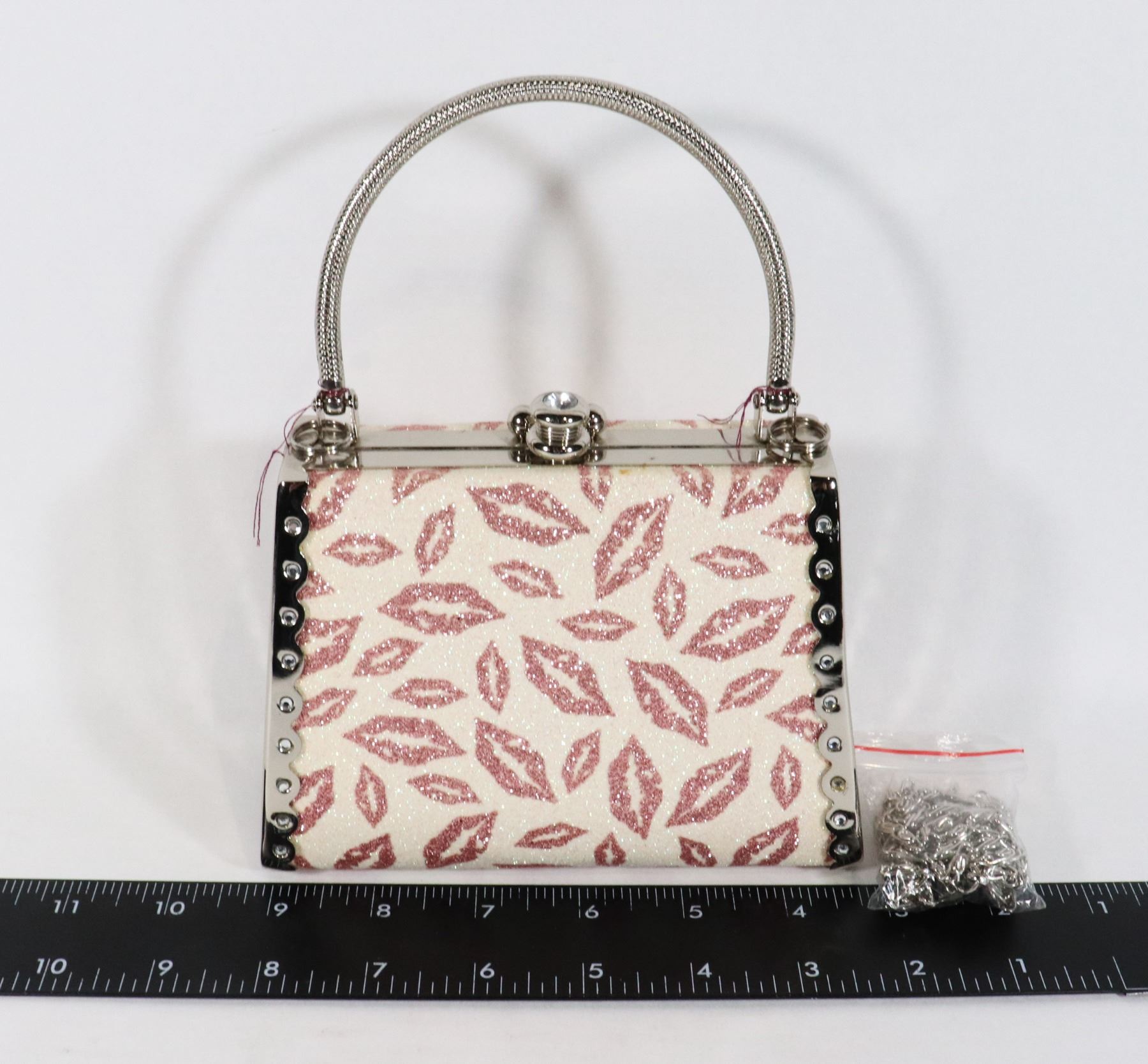 HAS DETACHABLE METAL SHOULDER CHAIN STRAP. HAVE RHINESTONE ACCENTS ON CLASP AND DOWN THE SIDE