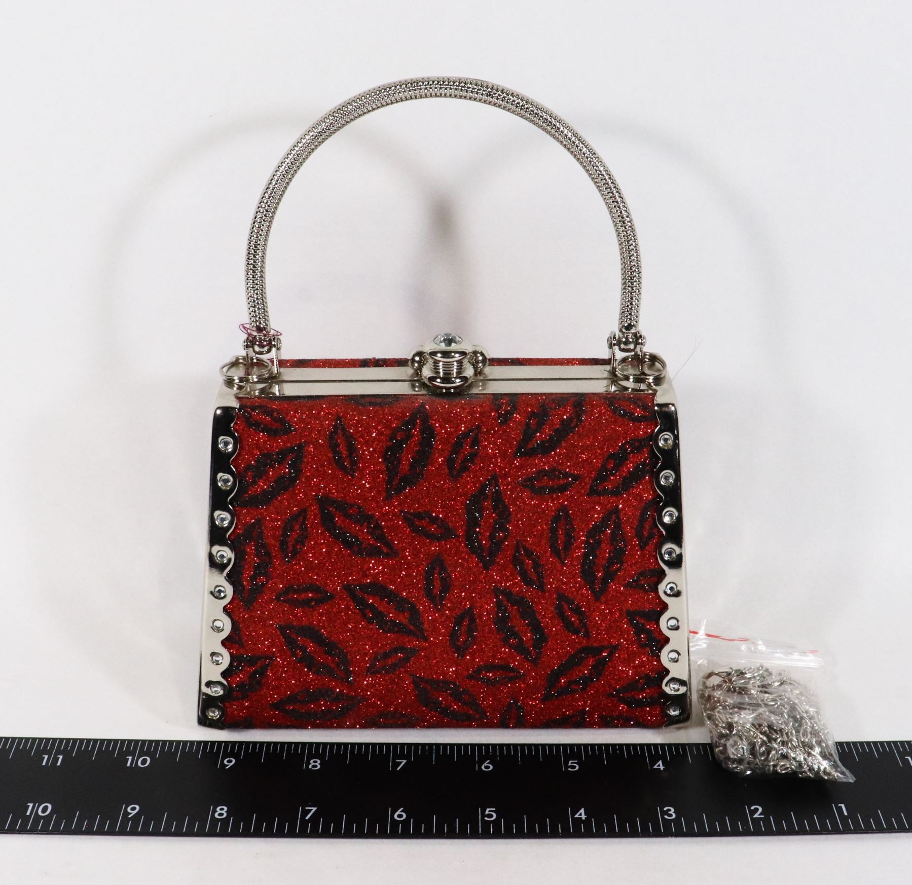 HAS DETACHABLE METAL SHOULDER CHAIN STRAP. HAVE RHINESTONE ACCENTS ON CLASP AND DOWN THE SIDE