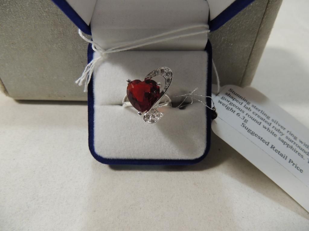 STUNNING STERLING SILVER RING WITH A HEART SHAPED LAB CREATED RUBY SURROUNDED BY GORGEOUS ROUND WHITE SAPPHIRES. TOTAL WEIGHT 6.3G AS SHOWN SEE PHOTO FOR MORE DETAILS