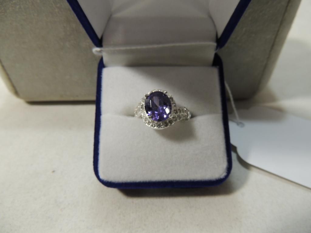 AMAZING STERLING SILVER RING WITH AN OVAL CUT AMETHYST STONE SURROUNDED BY BEAUTIFUL ROUND WHITE SAPPHIRES THE AMETHYST IS NEARLY 4CTS WITH A TOTAL WEIGHT OF 5.3G AS SHOWN SEE PHOTO FOR MORE DETAILS.