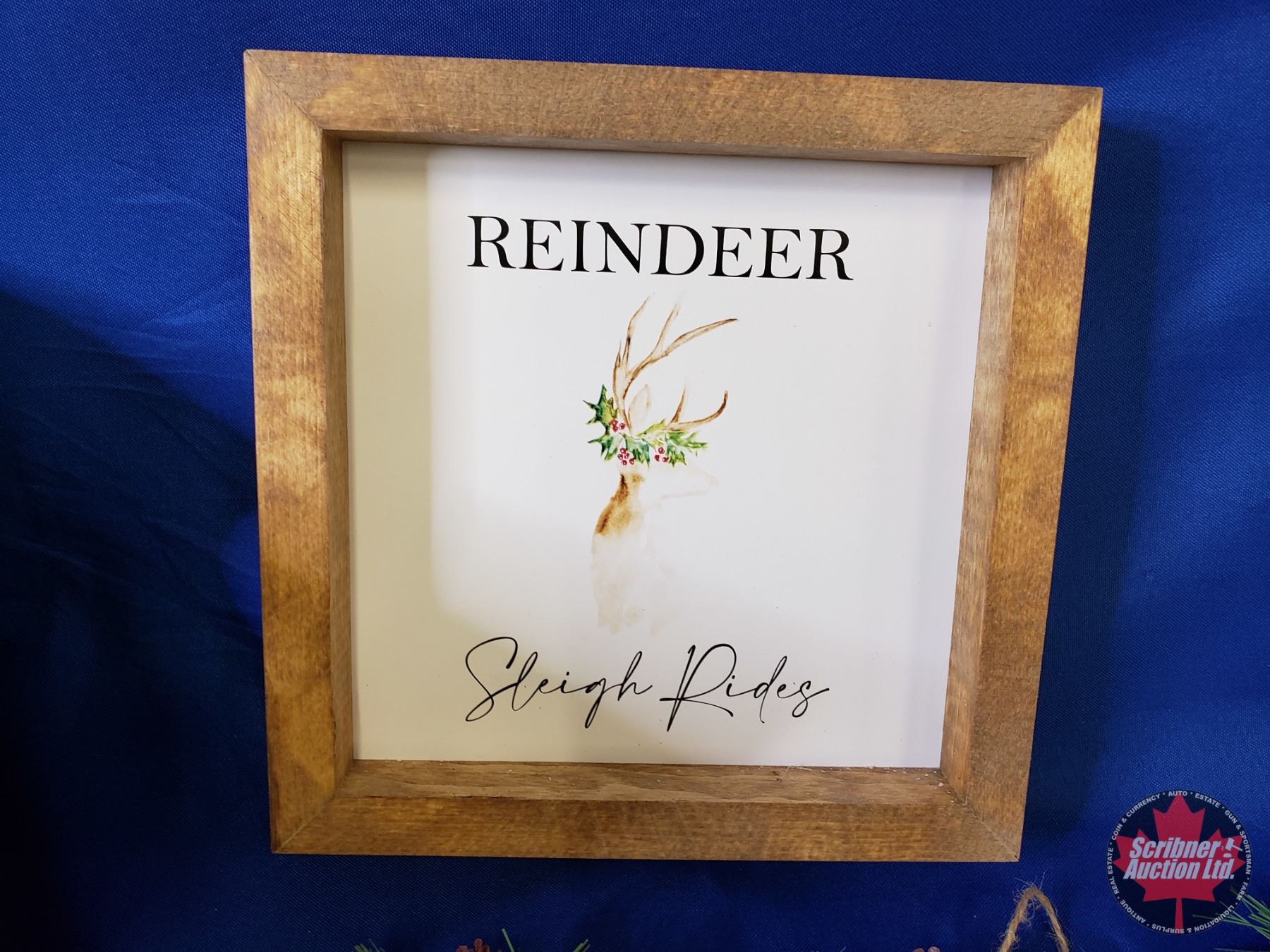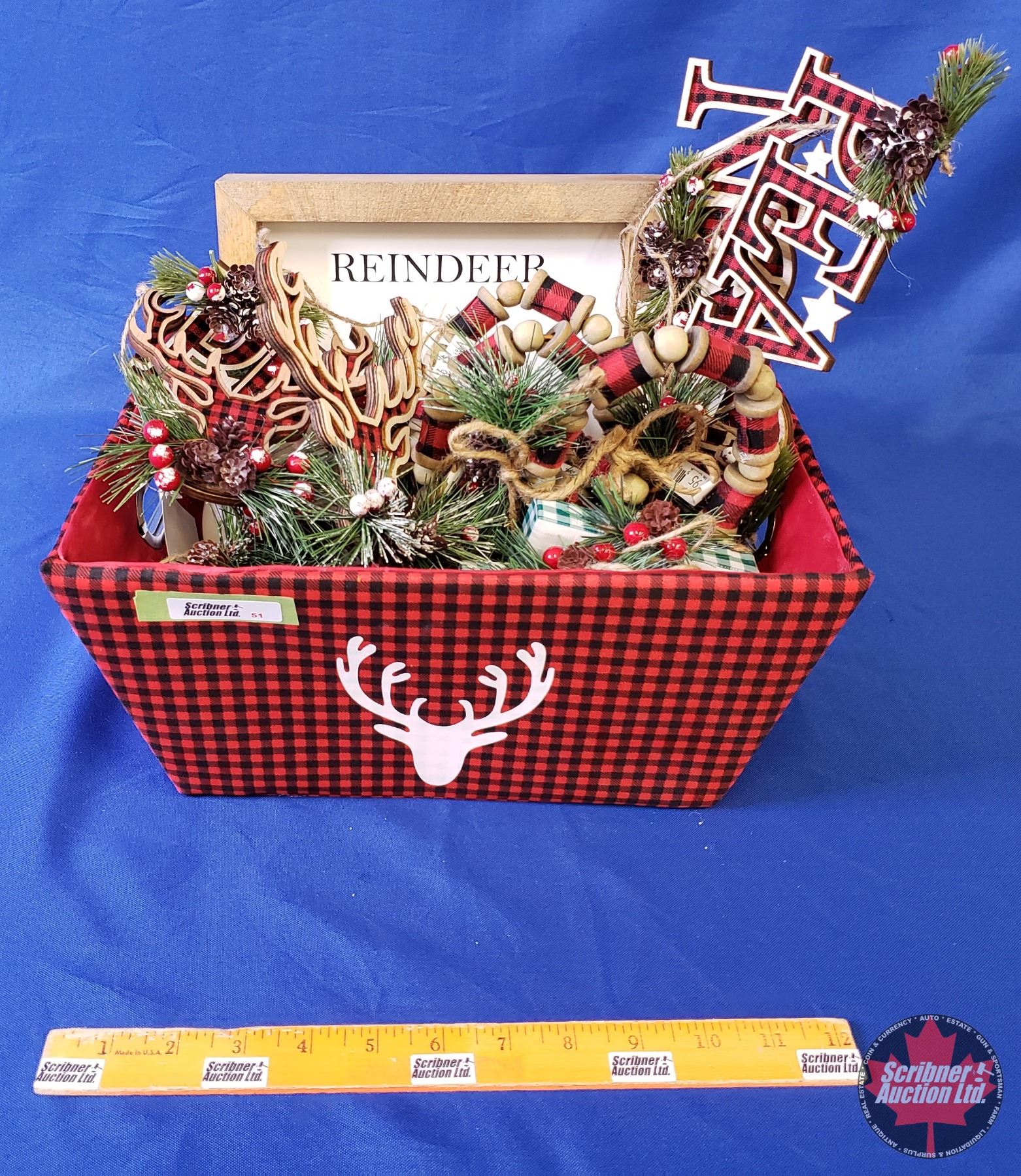 NEW STOCK: Christmas Décor Combo ~ Plaid/Reindeer Bin w/Contents (JOY; NOEL; PEACE (3); "Reindeer Sleigh Rides" Wall Block; Serendipity Candle; Ornaments; etc) (Bin Measures: 6"H x 13"W x 9-1/2"D) (SEE PICS!)