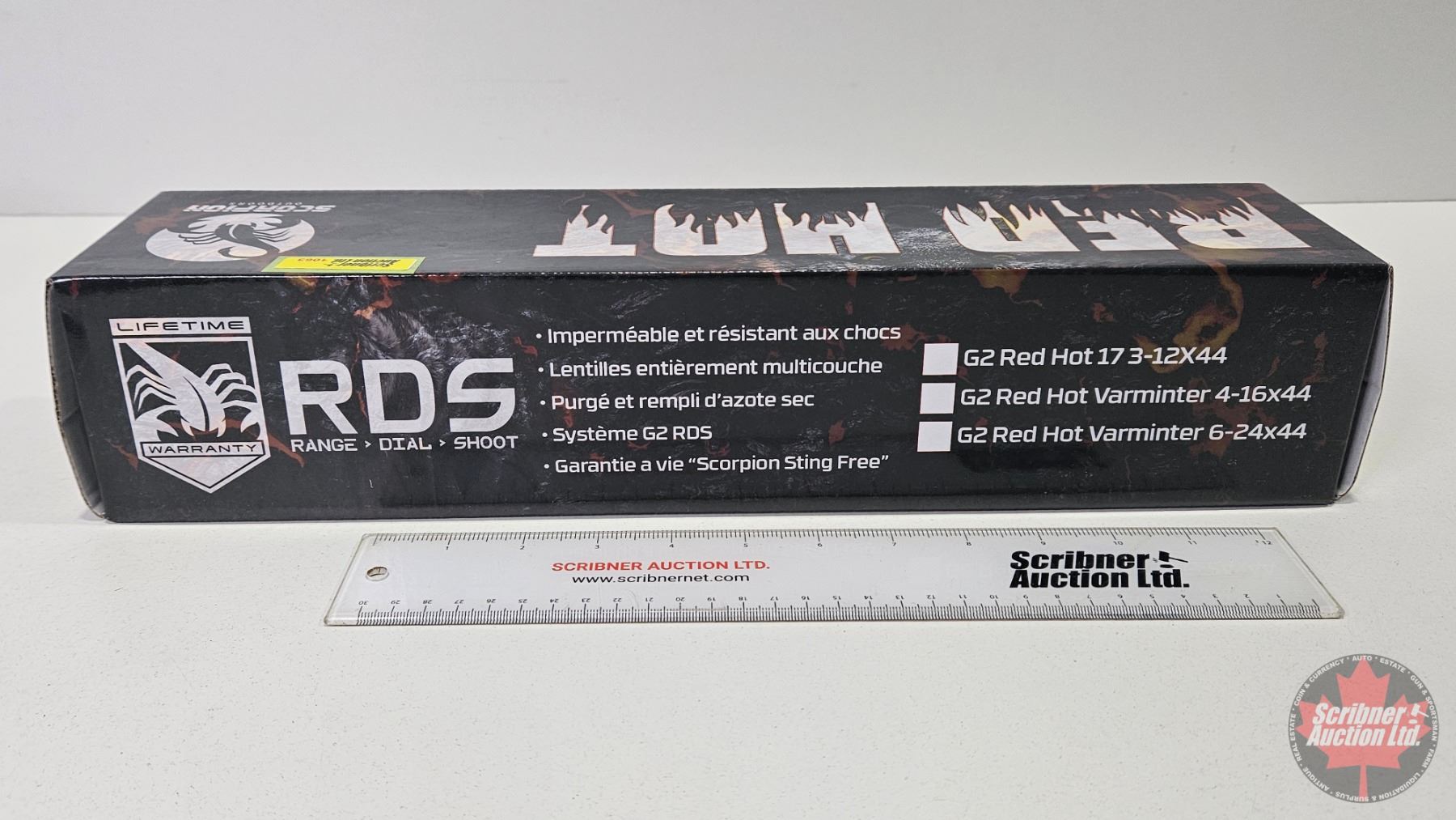 NEW SURPLUS : SCOPE : Scorpion G2 Red Hot RDS (3-12x44) (Box Measures : 4-1/4"H x 17-1/2"W x 4"D)