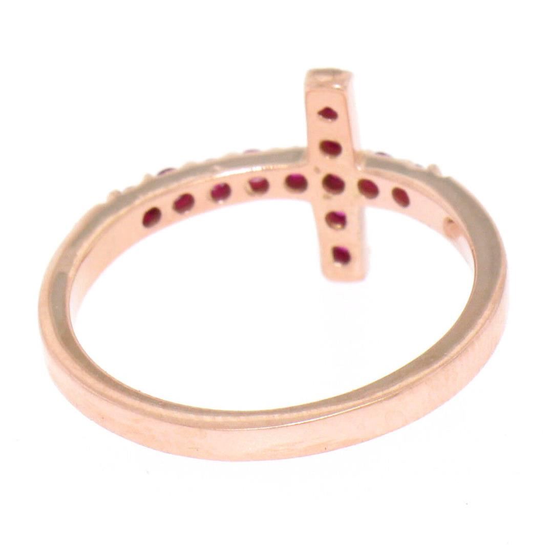 A new solid 14k rose gold cross band ring, with 12 round brilliant cut natural rubies (0.25ctw). The ring is size 6.0, weighs a total of 2.3 grams, and measures 11.0mm wide.