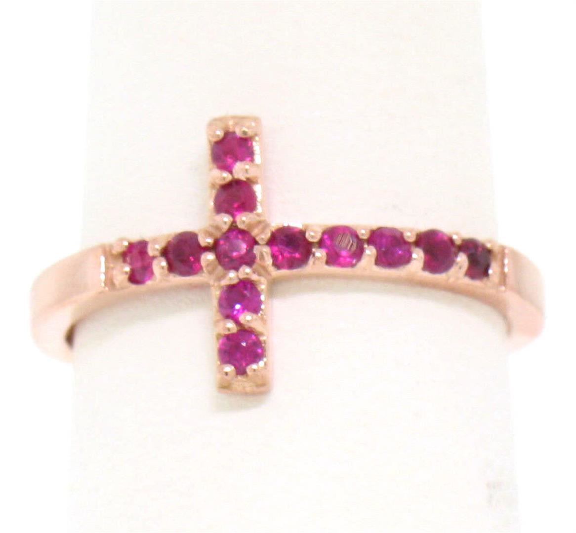 A new solid 14k rose gold cross band ring, with 12 round brilliant cut natural rubies (0.25ctw). The ring is size 6.0, weighs a total of 2.3 grams, and measures 11.0mm wide.