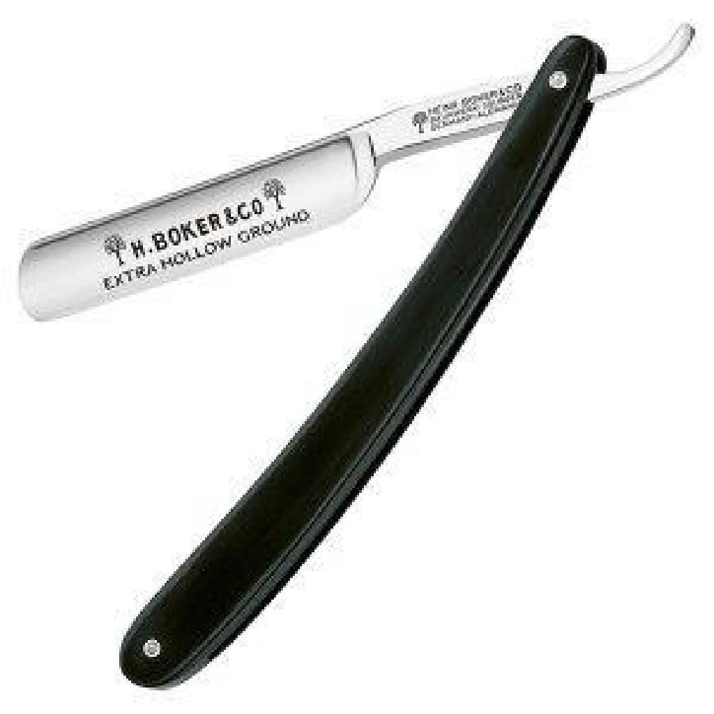 Short Description Straight Razor, Black Handle, Steel Blade, 4/8" Long Description The compact 4/8 inch blade is one of the top sellers in the long history of high-quality Boker razors. The non-stainless and high-performing blade steel is sharpened by hand according to an old tradition. The scales are made of a moisture resistant synthetic material. Entirely made by hand in the Boker Knife Manufactory in Solingen. Delivered with individual serial number, certificate of authenticity and care instructions. Comes in a traditional case. Features Blade Length: 2.75 in. Blade Width: 0.5 in. Weight: 1.2 oz.