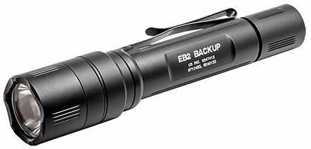 Mfr Items:Surefire Category:LIGHTS Model:EB2 Series:Backup Type:Flashlight Output:5/500 Lumens Bulb Type:LED OAL:5.8" Weight:4.2 oz Battery:CR123A Lithium (2) Proofs:Weatherproof Color:Black Material:Aerospace Grade Aluminum Head Diameter:1.1" Rechargeable:No Switch Type:Tailcap Click