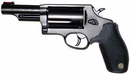 Mfr Items:Taurus Category:REVOLVERS Action:Single/Double Caliber:410/45 Colt (LC) Barrel Length:3.0" Capacity:5 Hammer Style:Spurred Grips:Black Ribber Sights:Fiber Optic Weight:29 oz Frame Description:Blued Frame Size:Small Cylinder Finish:Blued Barrel Finish:Blued OAL:9"