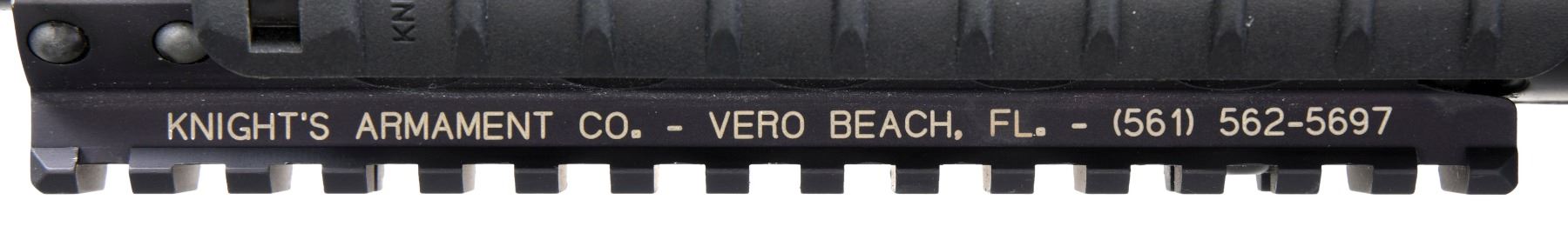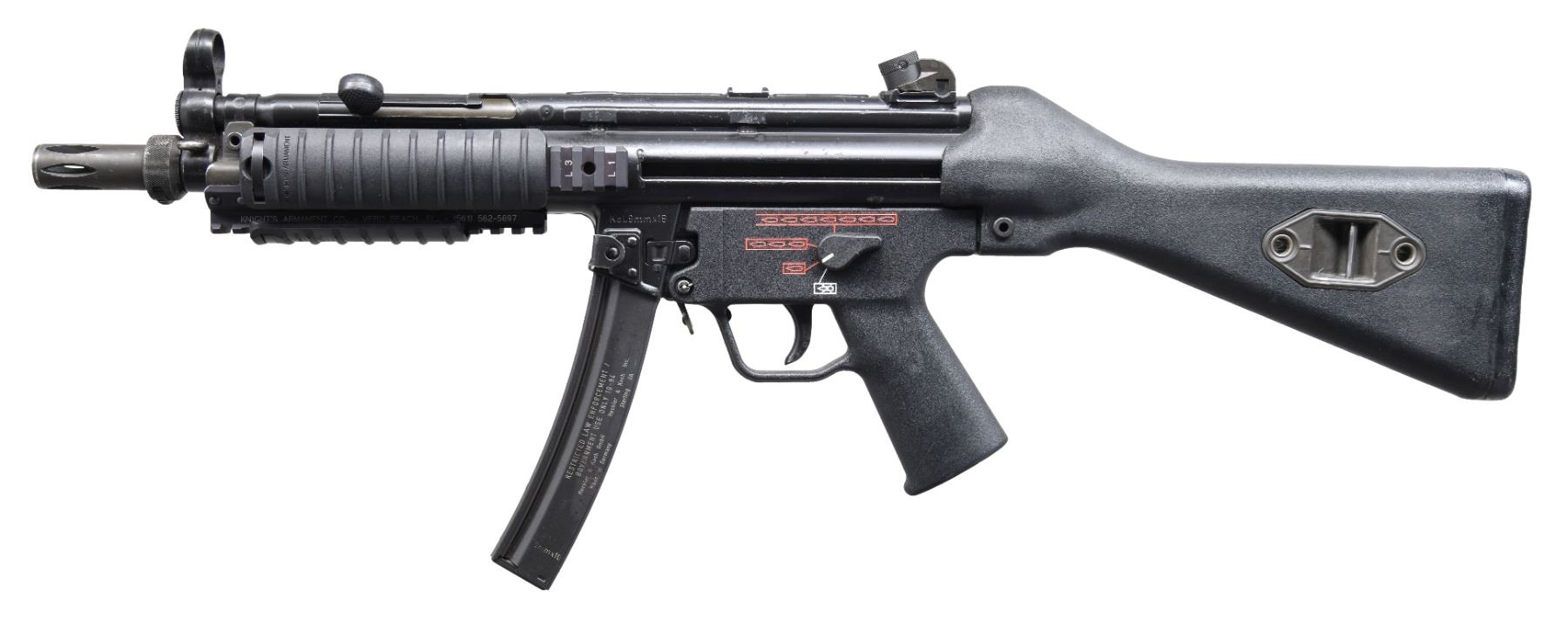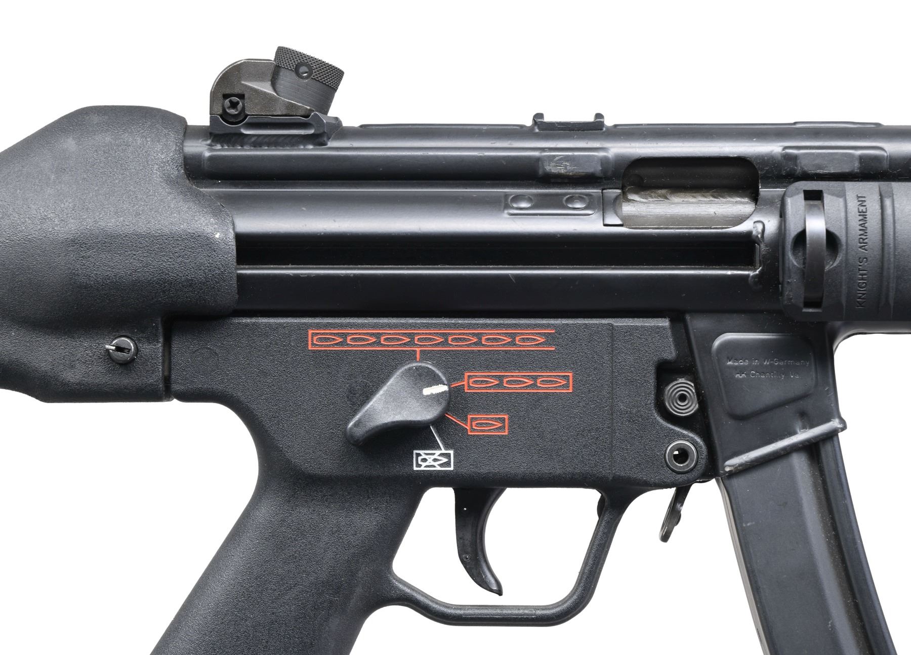 TRANSFERABLE FACTORY GERMAN HK MP5 SMG. Cal. 9mm parabellum. S# C317473. Bbl 10". An exceptional example of a very early, correct, original German MP5 SMG. A true German push-pin, swing-down receiver is an incredibly rare find as a fully transferable example. Top strap marked "HK MP5 / C317473" & Eagle over "N" signifying the federal insignia of Germany & suitable for use with smokeless powder, code "IE" indicating 1984 manufacture & "Antler" mark indicating ULM proof house. Left side mag.-well markings include "KAL 9mm x19". Right side of magazine well is marked "Made in Germany / HK Chantilly VA" where it was imported through. Front sight is a standard HK hooded post. Rear sight is the factory four position drum style peep sight. Site radius is approx. 13 1/2". Matte black painted finish. Paddle mag. release. A2, full length buttstock. Plastic, 4-position, pictogram swing-down trigger pack. Kinght's Armament Company forward rail system (PN 97198). 3-Lug barrel w/ factory lock-on flash hider. MAGS: 1 factory 30 rd marked "Restricted Law Enforcement / Government Use Only 10-94". CONDITION: Finish on metal surfaces is complete and consistent with the exception of some high edges such as where the a factory HK scope mount locks onto the receiver. This firearm is in terrific condition and is an excellent example of a very early iconic, original SMG that's passed the test of time & still wildly popular today. NATIONAL FIREARMS ACT MG REQUIRING BATF TRANSFER BEFORE TAKING POSSESSION. FULLY TRANSFERABLE. PROVENANCE: From the Lifelong Collection of Brian Linde. (03-1841/JZ). MODERN. CLASS III. $40,000-60,000.