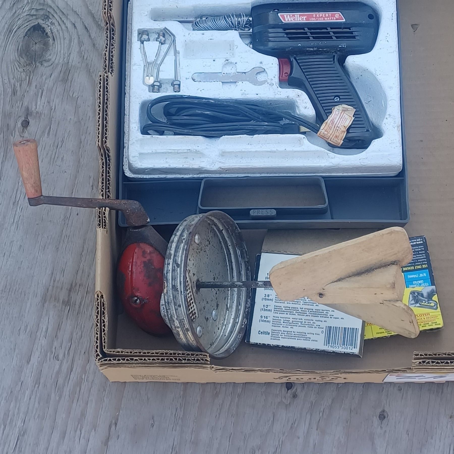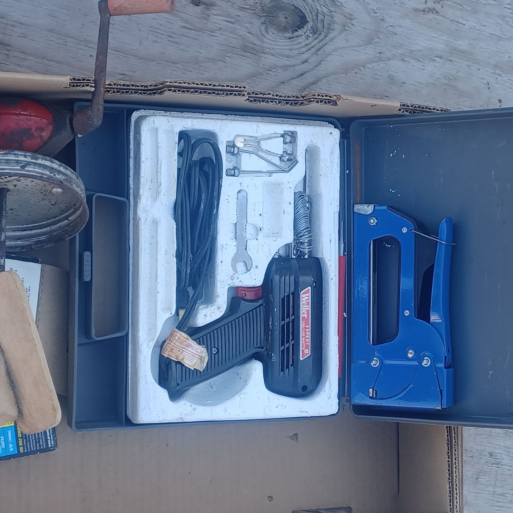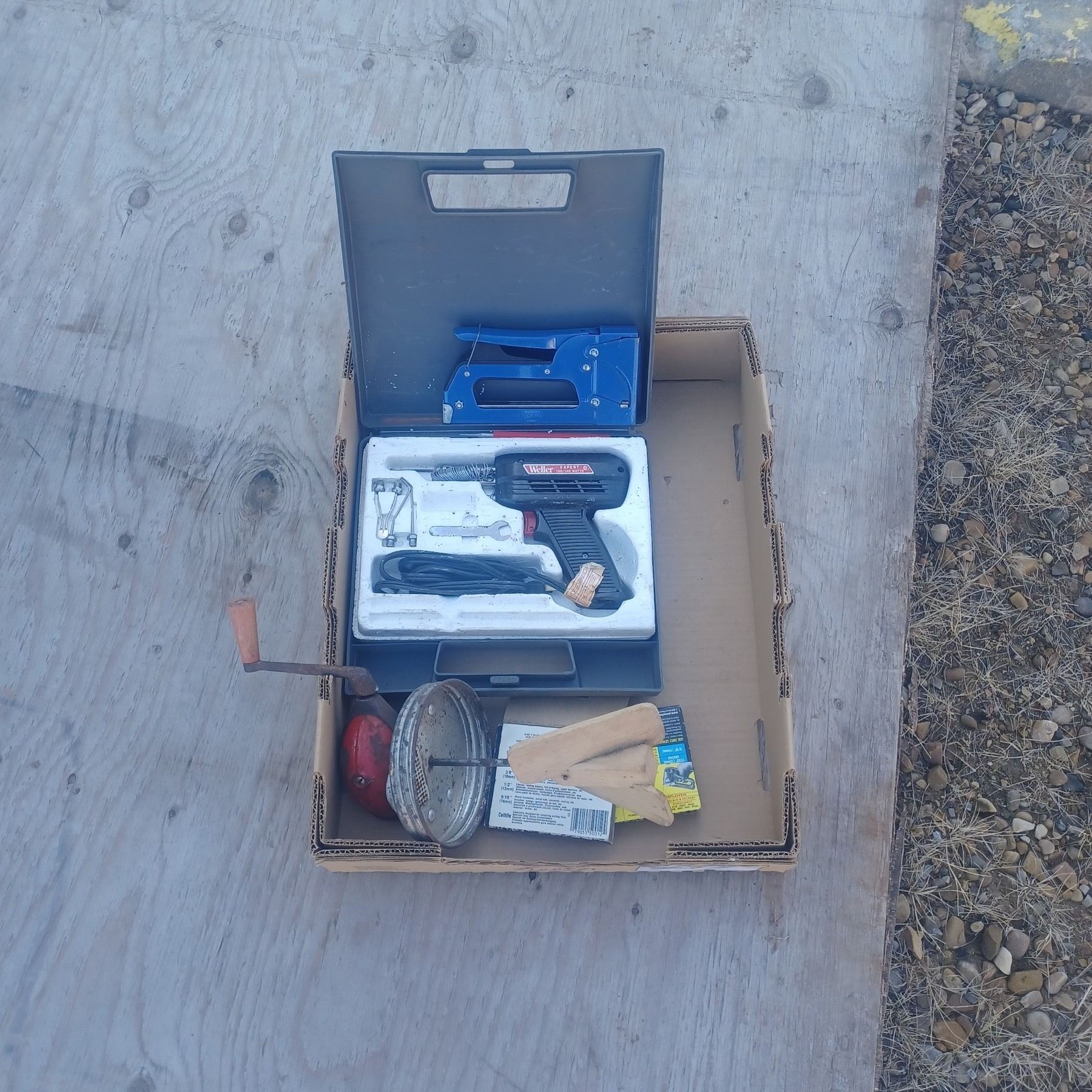 NEW TOOL POUCH , SOLDERING GUN KIT, STAPLER KIT AND ANTIQUE BUTTER CHURN TOP