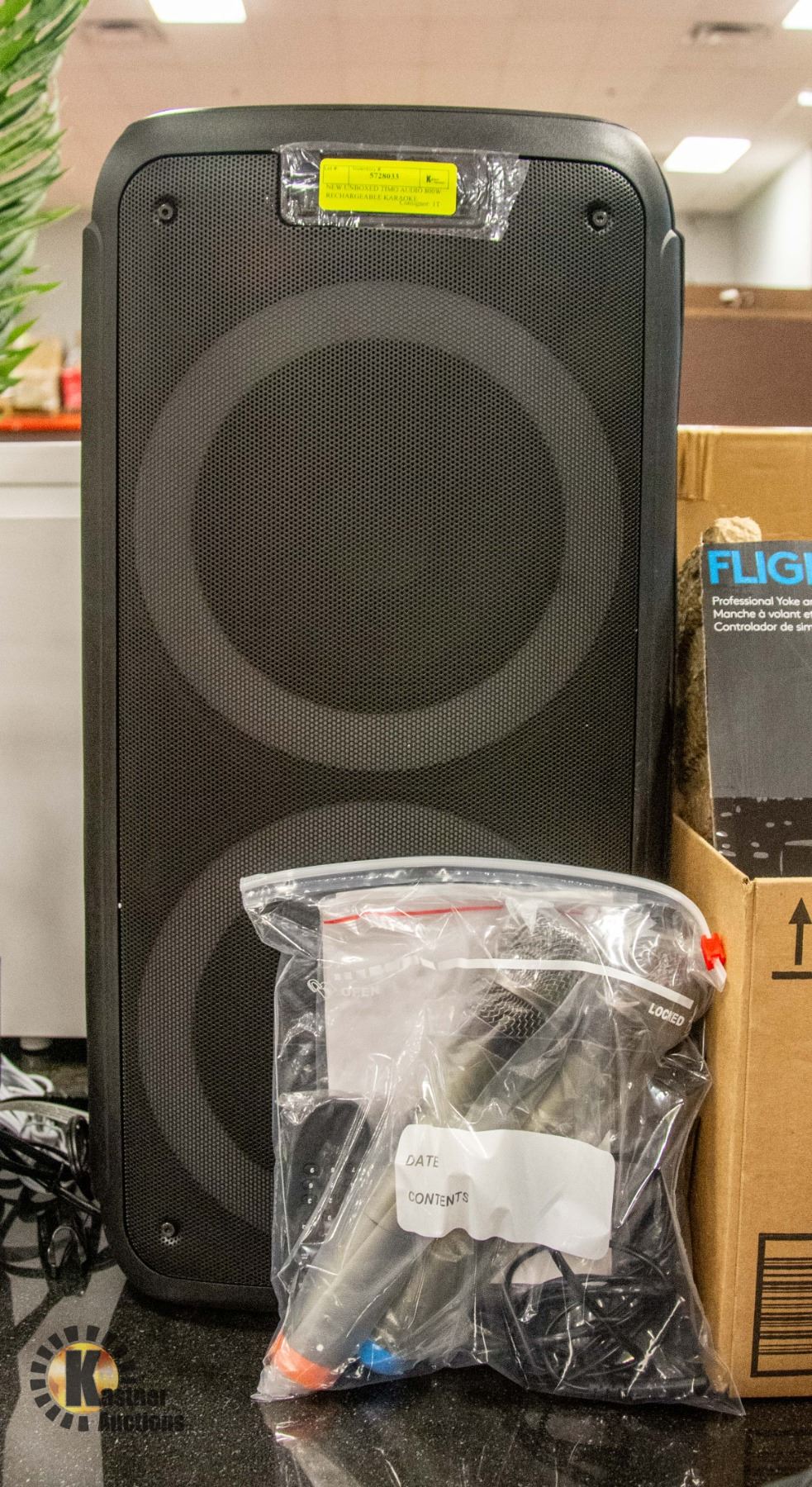 MACHINE WITH DUAL 8" WOOFERS, 2 UHF MICS, BLUETOOTH, LED LIGHTS, REMOTE CONTROL, AMZ SES, AMZ MSRP. $299.99 **SIDE OF OUTER CASING TO THE SPEAKER IS CRACKED ON THE EDGE OF FRAME, DAMAGE IS COSMETIC ONLY, SEE PHOTOS** **ALL ITEMS MUST BE REMOVED BY 5PM SATURDAY, NOVEMBER 25TH 2023. ALL REMAINING ITEMS WILL BE SUBJECT TO A $6.00 PER DAY STORAGE CHARGE. ANY ITEMS REMAINING AFTER MONDAY, DECEMBER 11TH, 2023 WILL BE CONSIDERED FORFEITED. NO REFUNDS WILL BE ISSUED FOR FORFEITED ITEMS. TO SCHEDULE A PICK UP APPOINTMENT CLICK HERE