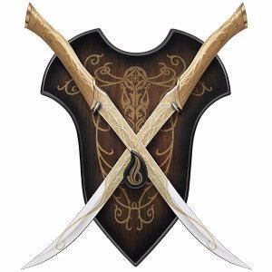 United Cutlery, industry leader in fine movie reproductions, has meticulously recreated these breathtaking props using only the finest grade materials and craftsmanship. Attention to detail was a top priority to ensure these blades match the actual filming prop as closely as possible. These officially licensed replicas from The Hobbit Trilogy bring to life the fighting knives wielded by Legolas Greenleaf. In the series, Legolas wields these twin fighting knives with incredible speed and savagery. Features Razor-sharp stainless steel blades Handcrafted solid wood handles Solid metal guard and pommel Elven vine decorative accents Certificate of Authenticity Includes display plaque 15 inch blade; 22 3/8 inches overall