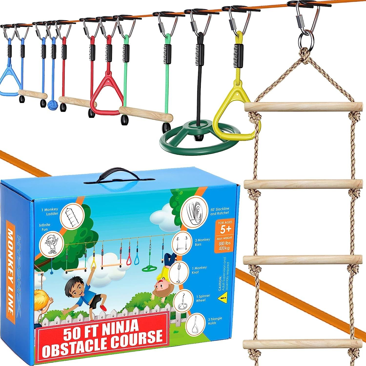 FOR KIDS, COMES WITH 9 DURABLE OBSTACLES, WEATHER PROOF, EASY TO SET UP ON TREES OR POSTS.