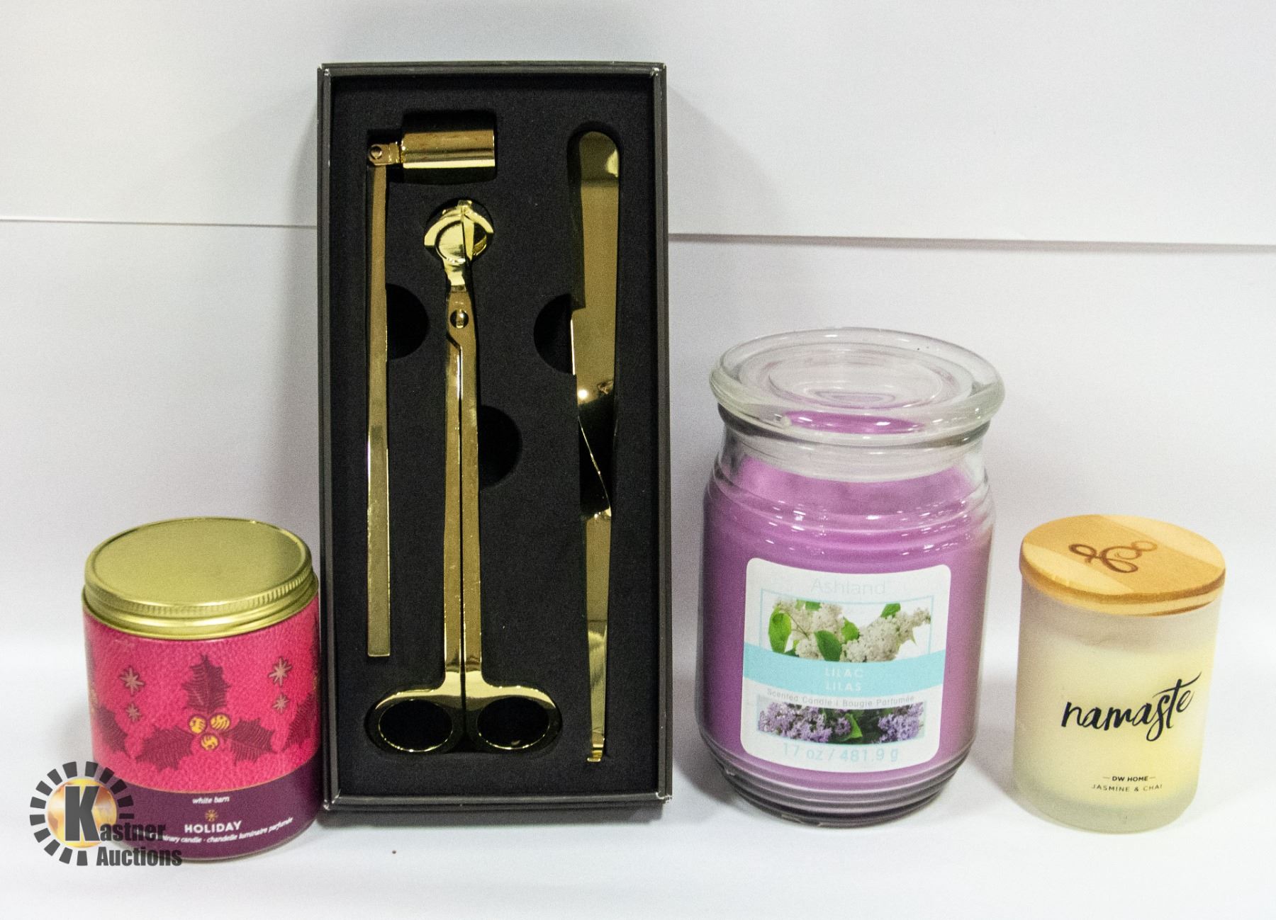 CANDLE TOOL SET W/NEW NAMASTE JASMINE & CHIA CANDLE, ASHLAND LILAC, WHITE BARN HOLIDAY (ALL LIDDED)     **ALL ITEMS MUST BE REMOVED BY 5PM SATURDAY, NOVEMBER 23RD 2024. ALL REMAINING ITEMS WILL BE SUBJECT TO A $6.00 PER DAY STORAGE CHARGE. ANY ITEMS REMAINING AFTER MONDAY, DECEMBER 9TH 2024 WILL BE CONSIDERED FORFEITED. NO REFUNDS WILL BE ISSUED FOR FORFEITED ITEMS. TO SCHEDULE A PICK UP APPOINTMENT CLICK HERE