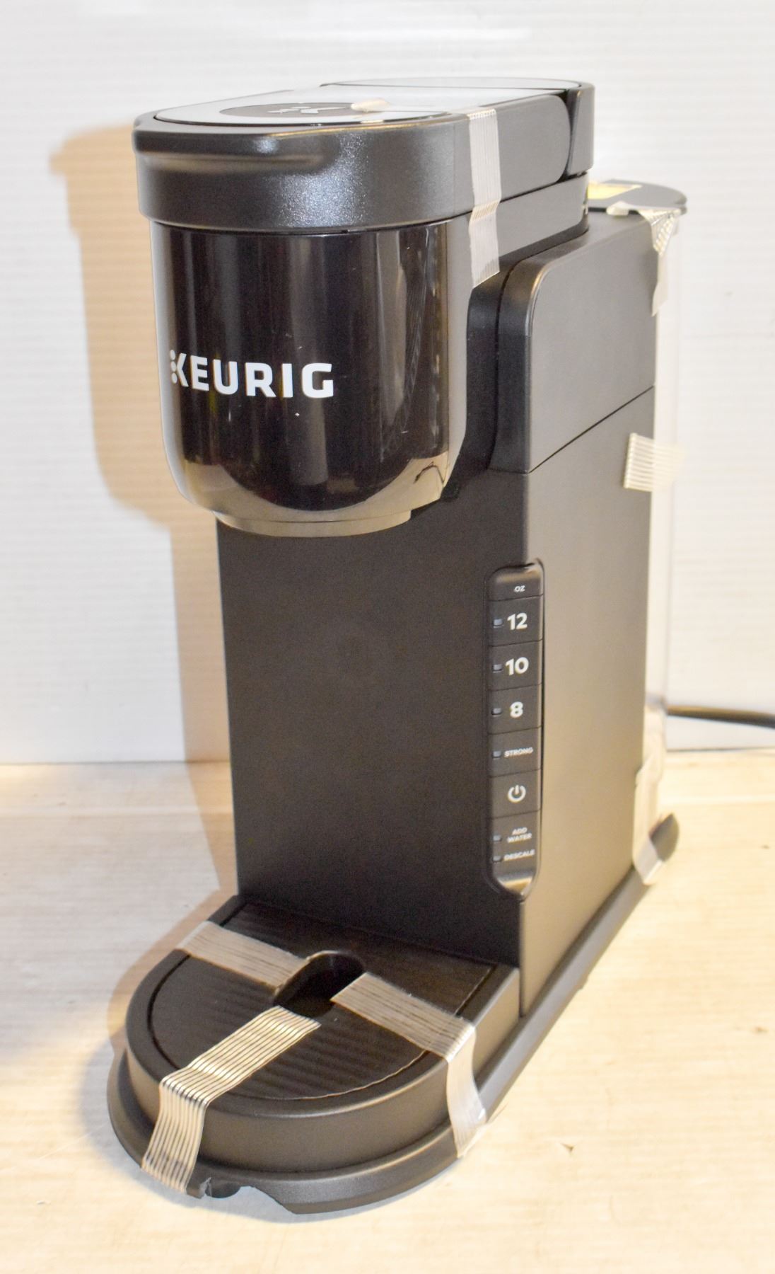 MAKER, 3 CUP SIZES, STRONG BREW, 1.24L REMOVEABLE RESERVOIR, BLACK, TESTED, PARTS CONFIRMED, **DAMAGE TO PLASTIC BASE FROM SHIPPING, MINOR SUPERFICIAL CRACKS, DOES NOT EFFECT FUNCTIONALITY, SEE PICTURES, AMZ SES