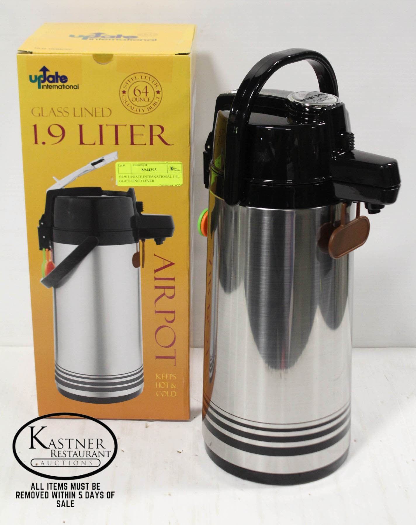 AIR POT. M# NLD-19/BK/SF, 64 OUNCE CAPACITY, REVOLVING NON-SLIP BASE. COMES W/ COLOURED TAGS. INSULATES HOT & COLD. NEW IN BOX **ALL ITEMS MUST BE REMOVED BY 5PM MONDAY, AUGUST 1ST, 2022. ALL REMAINING ITEMS WILL BE SUBJECT TO A $6.00 PER DAY STORAGE CHARGE. ANY ITEMS REMAINING AFTER MONDAY, AUGUST 15, 2022 WILL BE CONSIDERED FORFEITED. NO REFUNDS WILL BE ISSUED FOR FORFEITED ITEMS.** TO SCHEDULE A PICK UP APPOINTMENT CLICK HERE