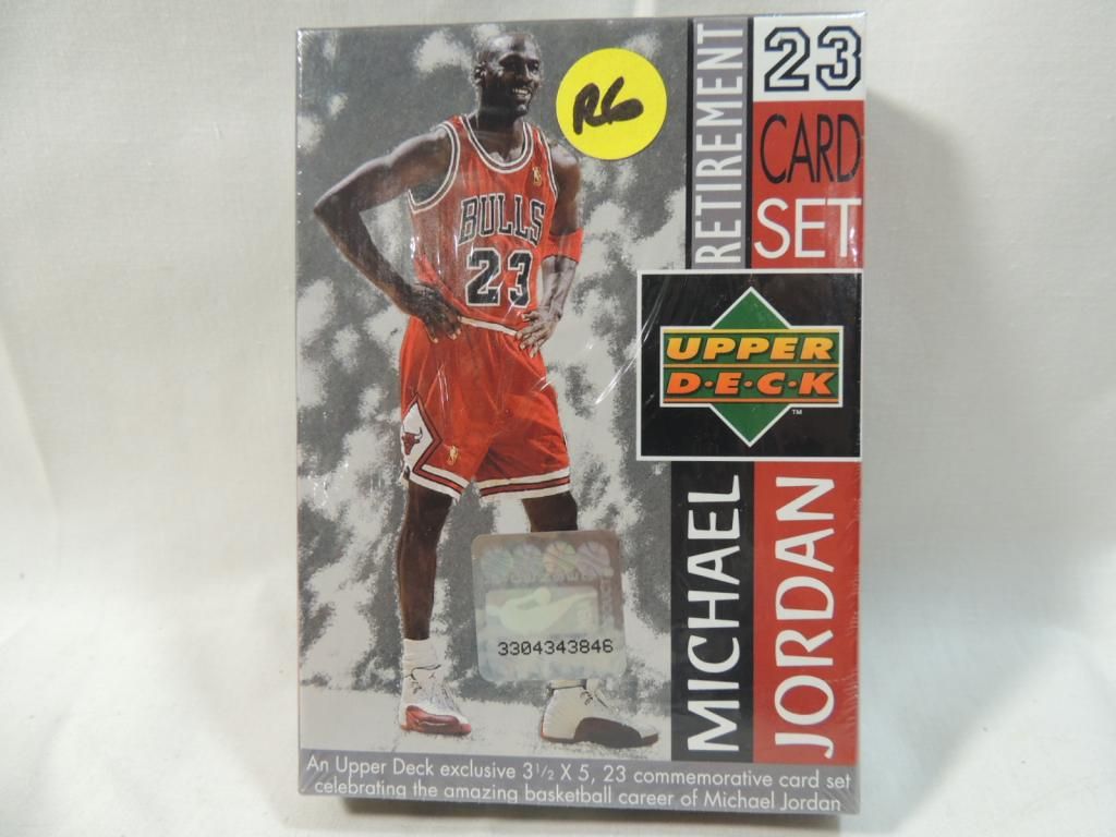 UPPER DECK EXCLUSIVE 3 1/2 X 5, 23 COMMEMORATIVE CARD SET CELEBRATING THE AMAZING BASKETBALL CAREER OF MICHAEL JORDAN. SEALED NEW IN BOX SET.
