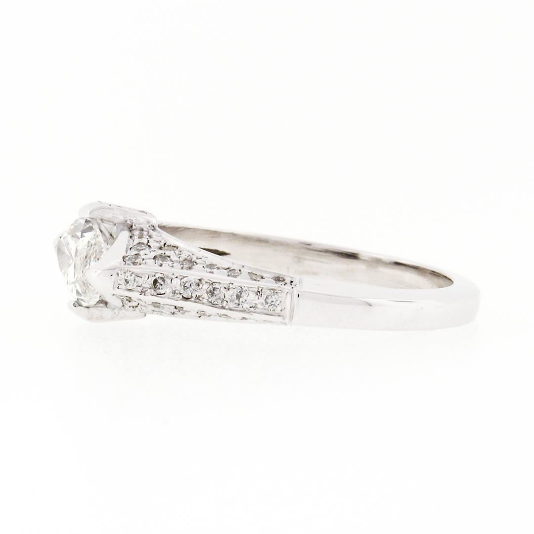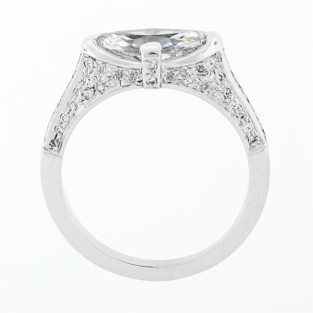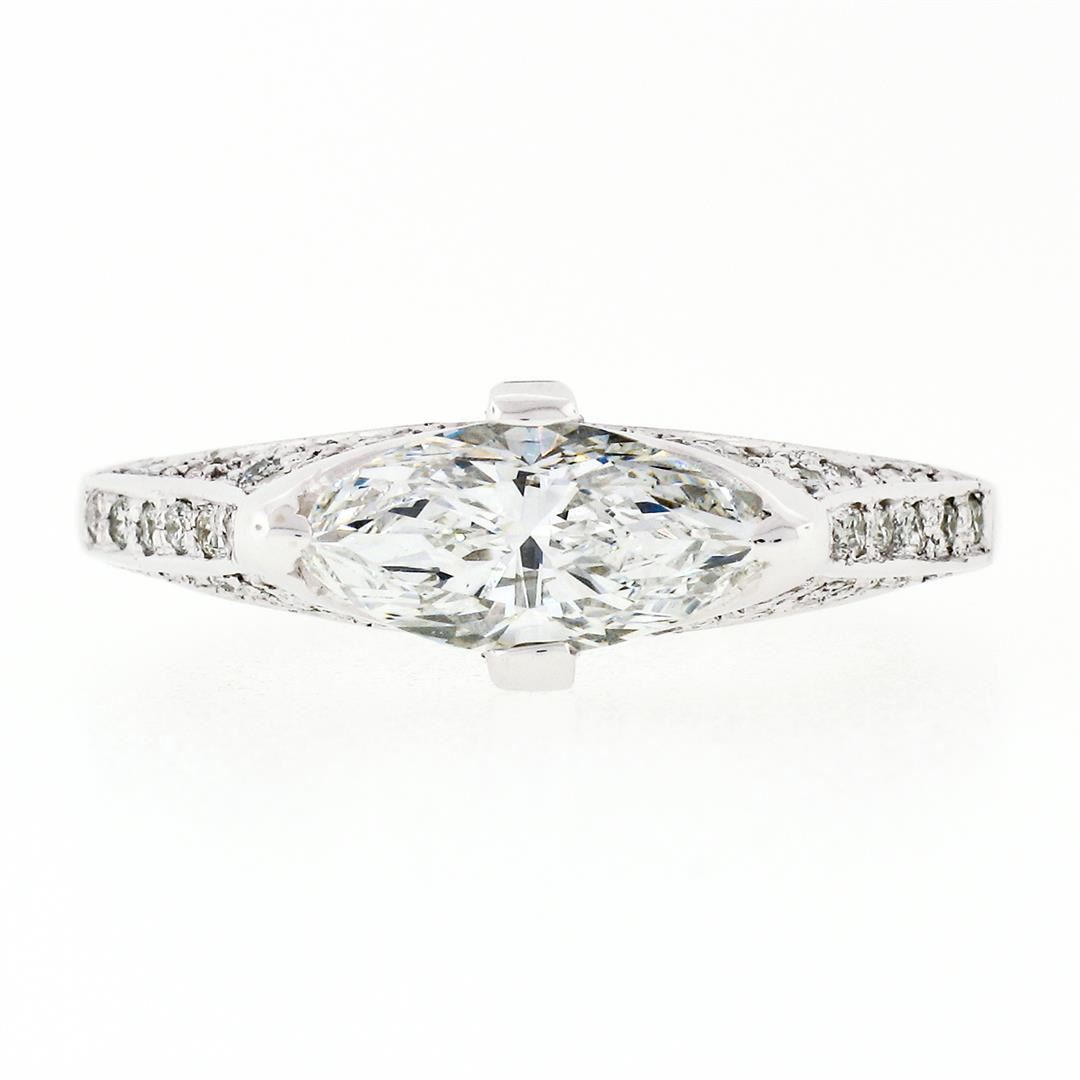 A new solid 18k white gold solitaire engagement ring, featuring 1 Gia certified marquise cut natural diamond (E - VS2 ; 1.15ct ), accented with 60 round brilliant cut natural diamonds (E/F - VS1/VS2 ; 0.35ctw). The ring is size 6.5, weighs a total of 4.57 grams, and measures 6.71mm wide. Comes with all original relevant certifications.