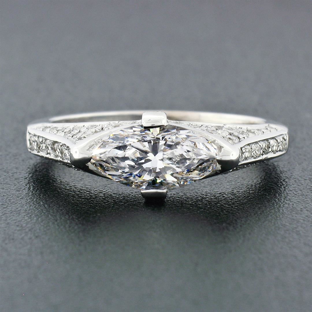 NEW Unique 18k White Gold 1.5 ctw GIA Marquise Cut Solitaire & Round Diamond Rin