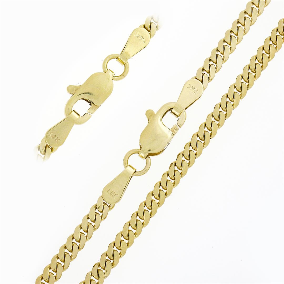 A new solid 14k yellow gold cuban curb link chain necklace. It weighs a total of 10.6 grams, measures 2.6mm wide, and measures 20 inches in length.