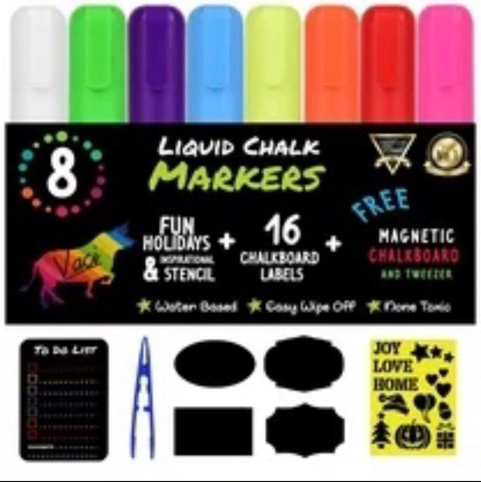 NEW VACY LIQUID CHALK MARKERS SET 8 PACK SET WITH CHALK BOARD LABELS, MAGNETIC BLACK BOARD AND TWEEZER, 16 LABELS AND DRAWING STENSILS, RETAIL PRICE PP 14.29, TOTAL LOT RETAIL VALUE $714.50