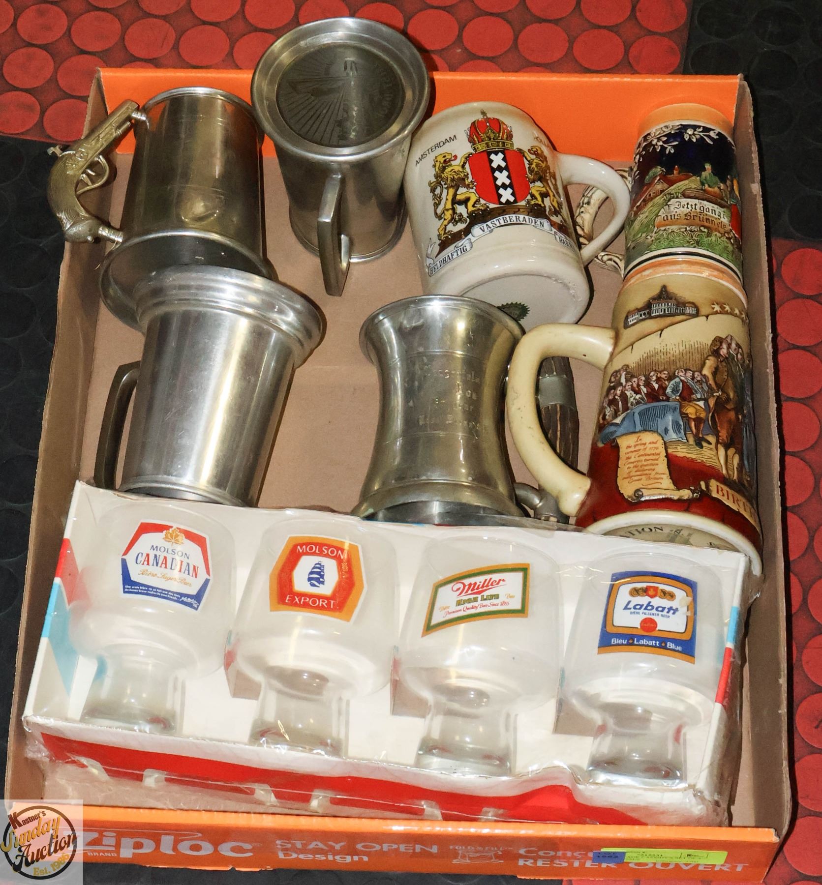 475ML CAPACITY + GLASS BOTTOMED BEER MUGS + ONE BONE HANDLED - ALL DIFFERENT **ALL PROCEEDS FROM THIS LOT WILL GO TO -IN THE WOODS ANIMAL RESCUE** **ALL ITEMS MUST BE REMOVED BY 5PM SATURDAY, JUNE 28th 2025. ALL REMAINING ITEMS WILL BE SUBJECT TO A $6.00 PER DAY STORAGE CHARGE. ANY ITEMS REMAINING AFTER MONDAY, JULY 14TH 2025 WILL BE CONSIDERED FORFEITED. NO REFUNDS WILL BE ISSUED FOR FORFEITED ITEMS. TO SCHEDULE A PICK UP APPOINTMENT CLICK HERE