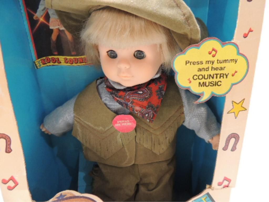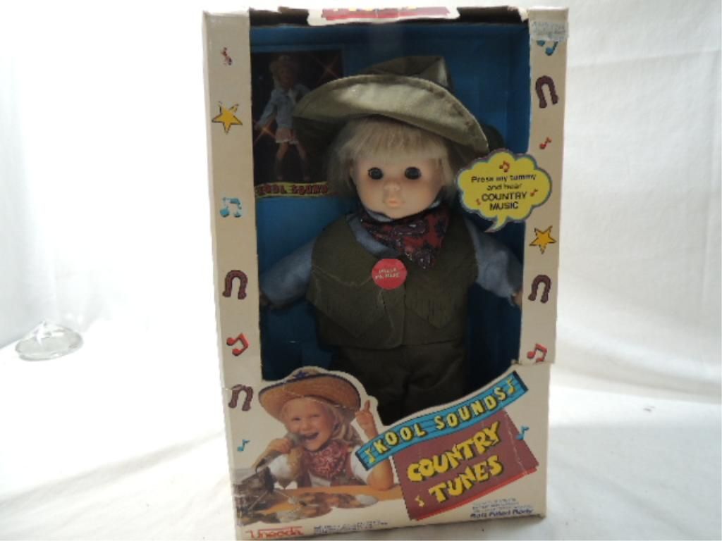 KOOL SOUNDS COUNTRY TUNES COWGIRL DOLL. PRESS HER TUMMY AND HEAR COUNTRY MUSIC. NEEDS BATTERIES. NEW IN BOX. AS SHOWN. SEE PHOTO FOR MORE DETAILS.