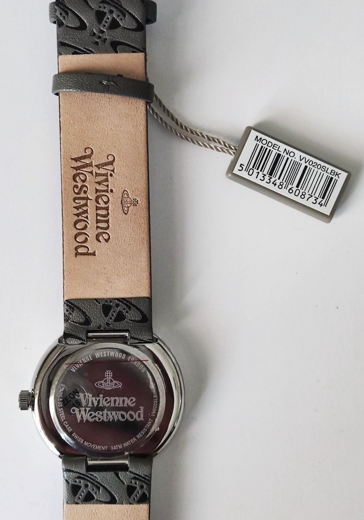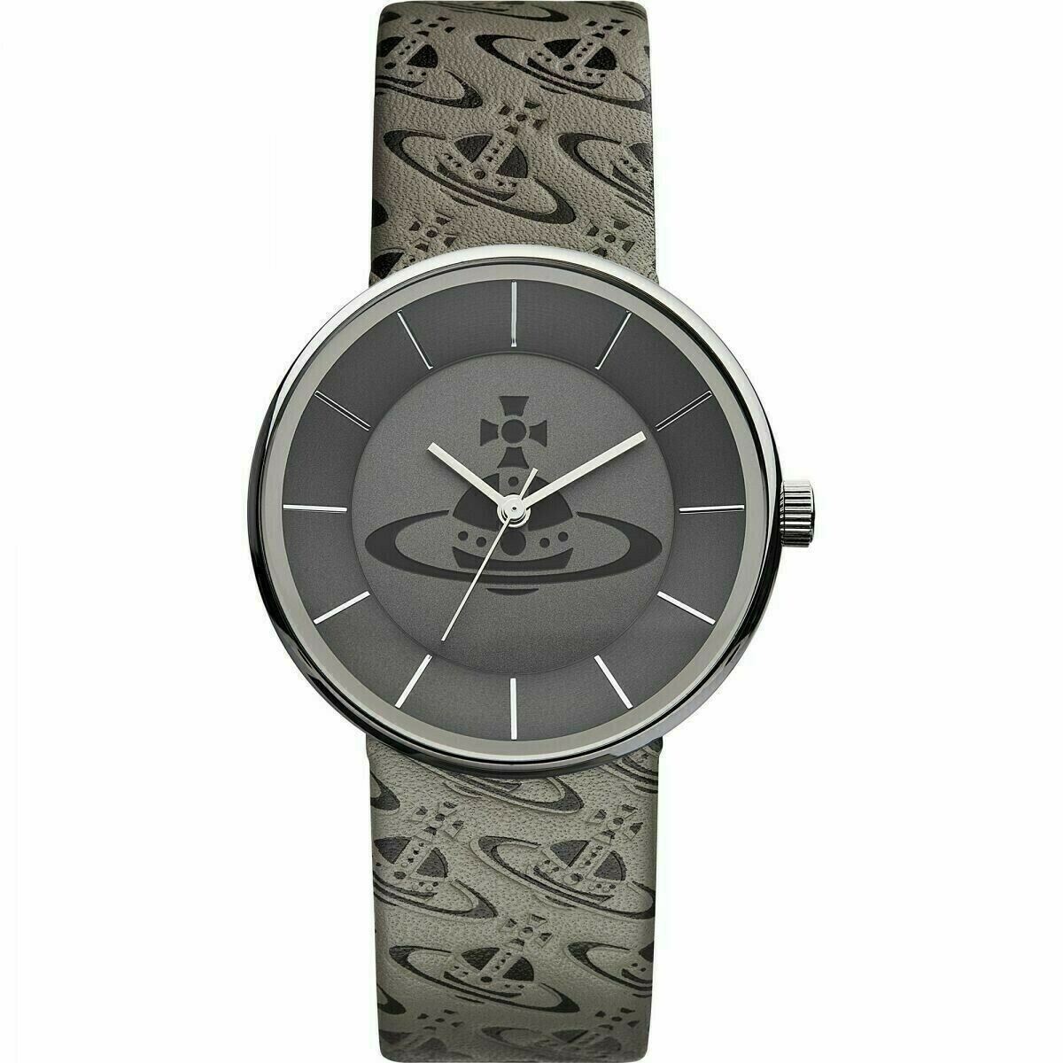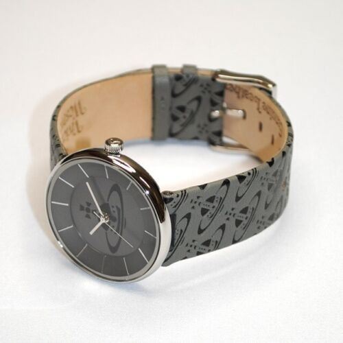 'Spirit' Model number: VV020SLBK. Grey Vivienne Westwood themed orb dial with silver markers and dial. Orb grey leather branded watch strap. Water resistant to 30 metres (3ATM/BAR). Swiss made Ronda Quartz movement.