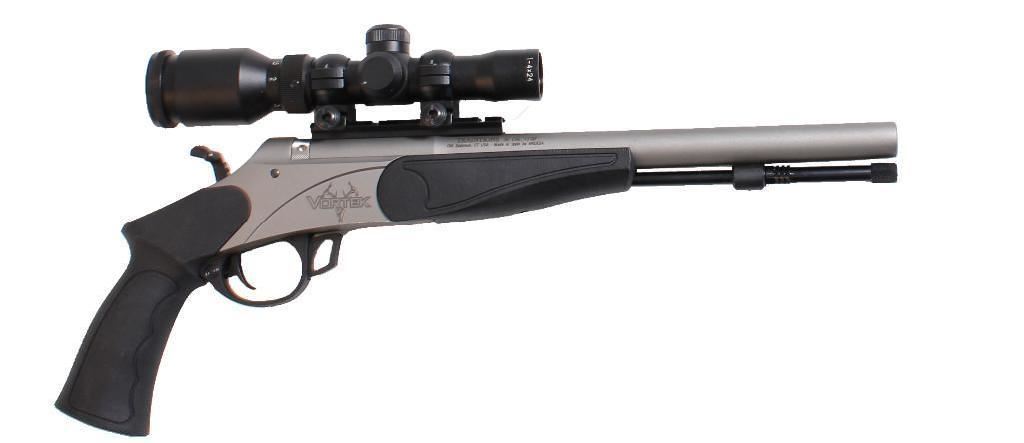 Designed after the performance-proven Vortek Muzzleloader Rifle, The new Vortek Pistol will add a new dimension of shooting for the blackpowder enthusiast. The break-open action with the Accelerator Breech Plug makes this rifle easy to shoot and clean! Now the Vortek Pistol is available with synthetic grips which make this pistol extra durable. Whether you are at the range punching holes in targets or looking to add a new element to your hunting experience, the Vortek Pistol can deliver! This pistol comes with a 1-4x24 matte black scope mounted and boresighted by a factory trained technician. Item #P1-151170 WARNING: Black powder firearms cannot be shipped to New Jersey, New York City, Illinois, Michigan, or Canada. For all other states, please review your state and local laws before ordering