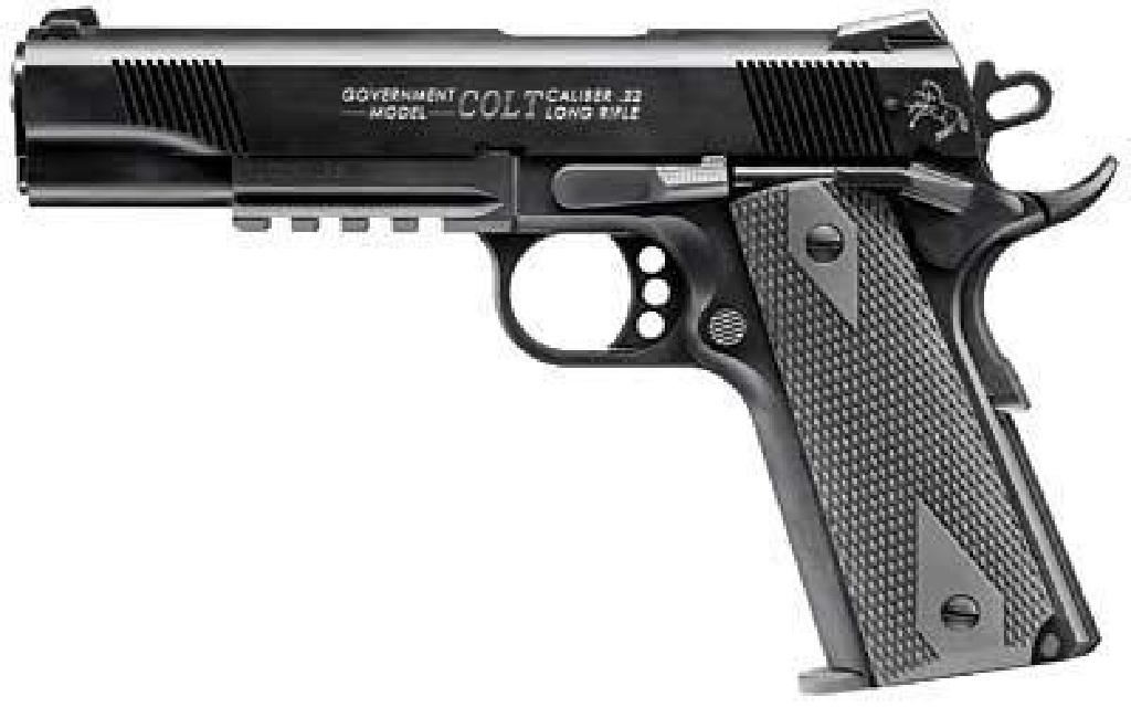 FAMILY:1911 Style Pistol Series MODEL:Colt Government 1911 A1 TYPE:Semi-Auto Pistol ACTION:Single Action FINISH:Matte STOCK/GRIPS:Black Rubber CALIBER/GAUGE:22 LR CAPACITY:12+1 BARREL:5" OVERALL LENGTH:8.6" RATE-OF-TWIST:1-in-13.75" SIGHTS:Combat-style Adjustable Sights SAFETY:Extended Thumb Safety ADDL INFO:Skeleton Trigger ADDL INFO:Beavertail Grip Safety ADDL INFO:Commander-style Hammer